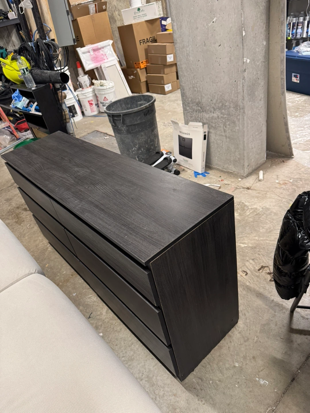 This dresser offers ample storage with its six deep drawers. The dark wood finish complements many decor styles. It's perfect for organizing bedrooms or living spaces.
