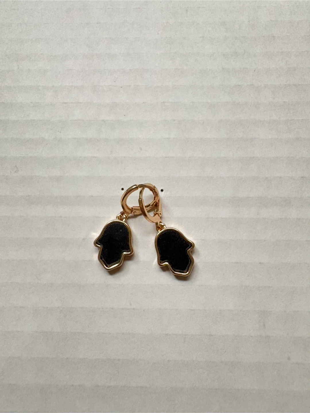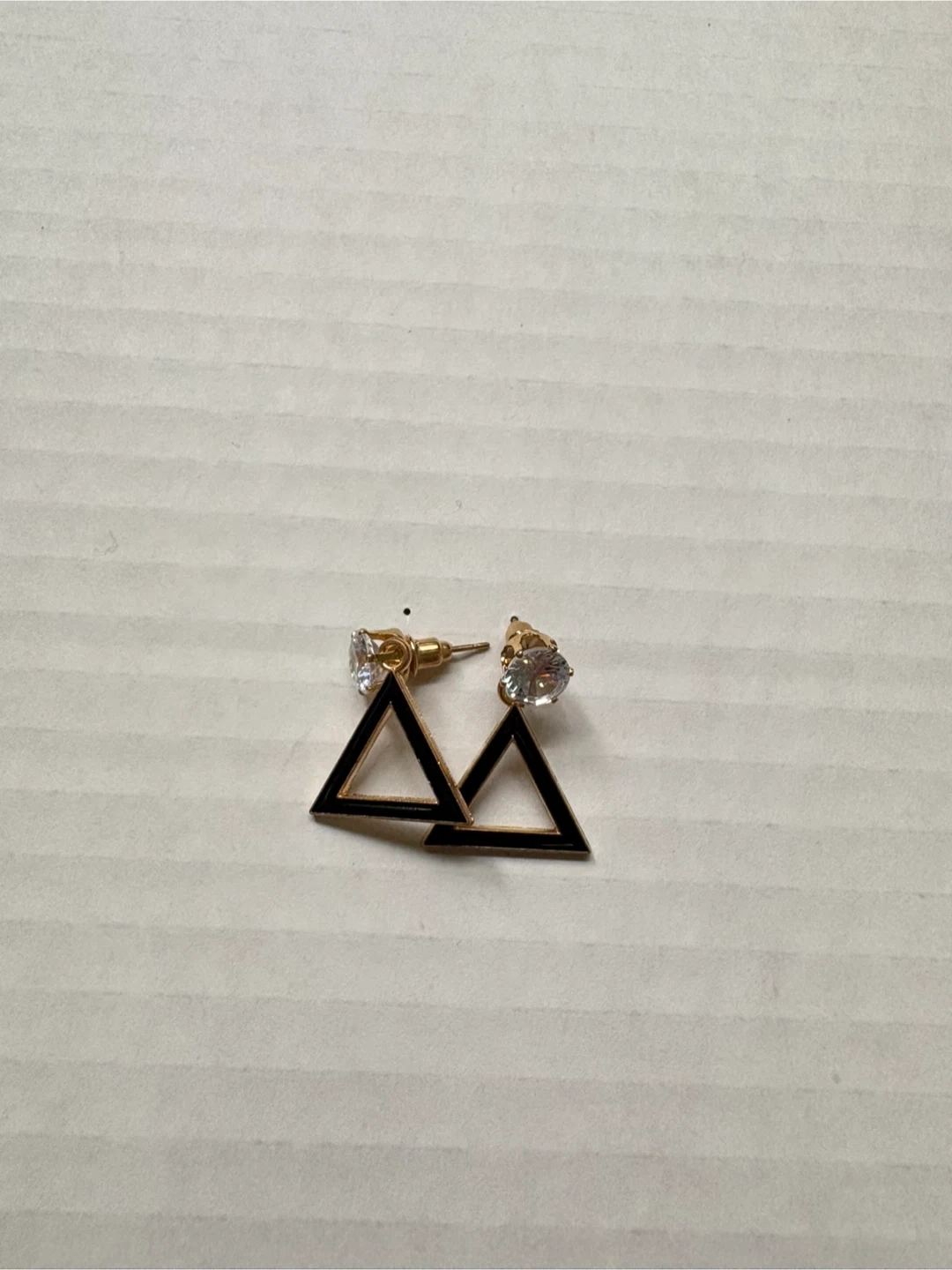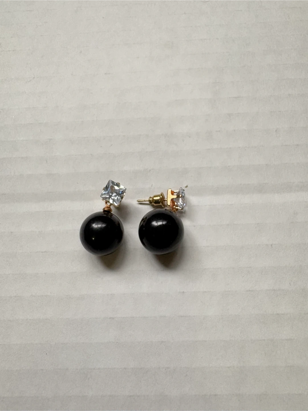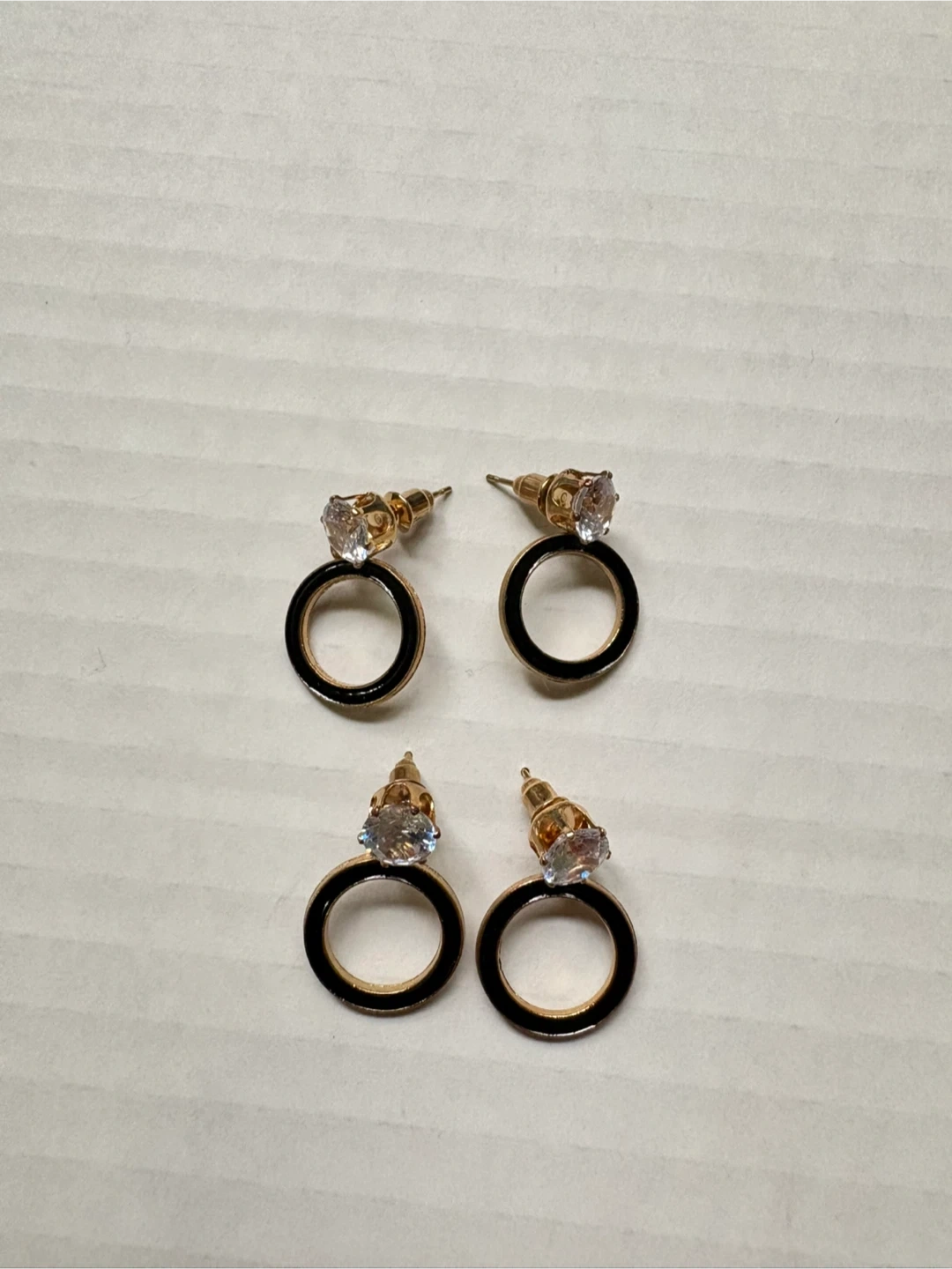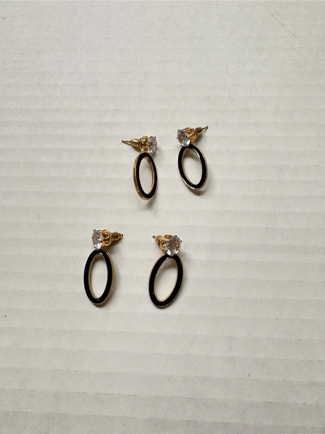 A collection of four pairs of fashion earrings. Includes oval-shaped earrings with black and gold accents and clear stones, as well as pearl-style stud earrings in grey, black, and pink. These are costume jewelry pieces. 5$ each