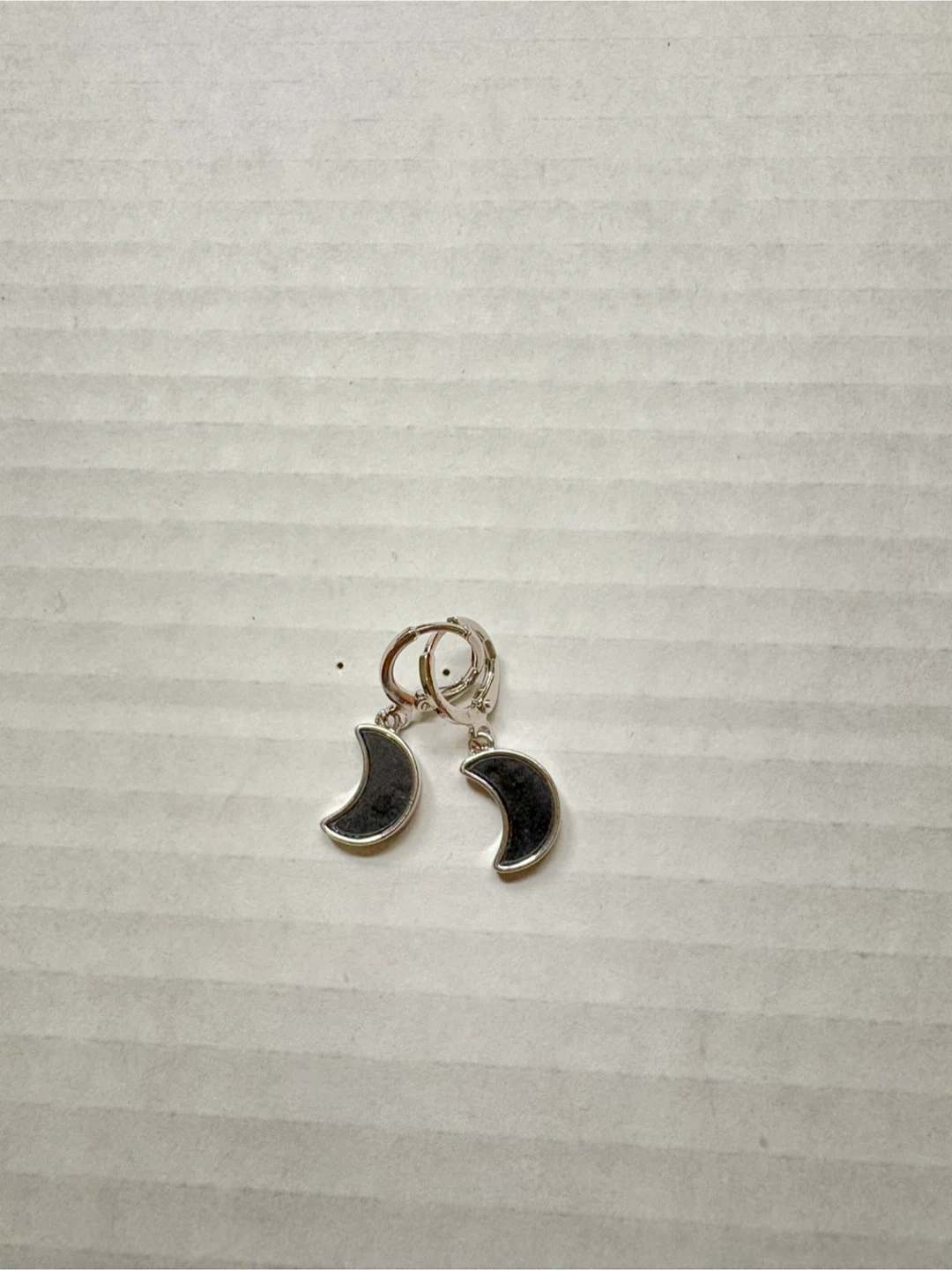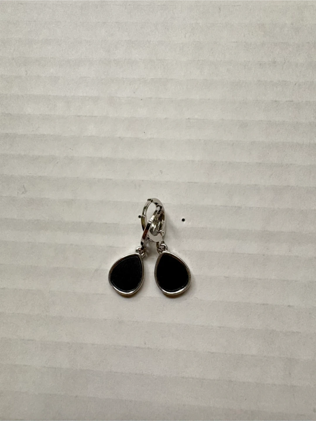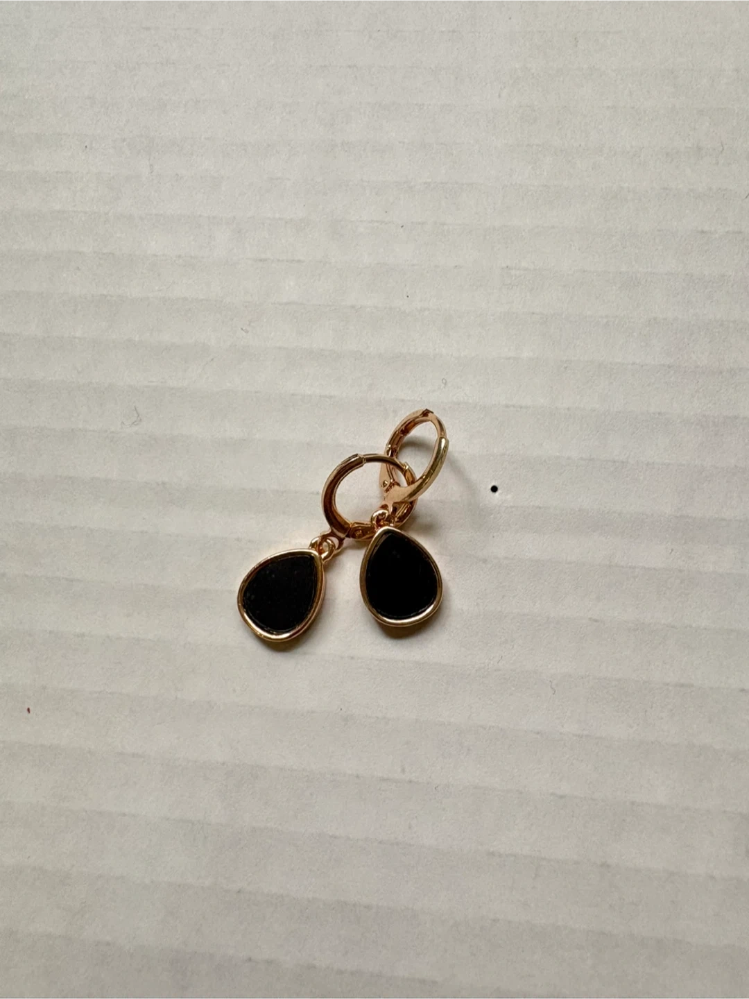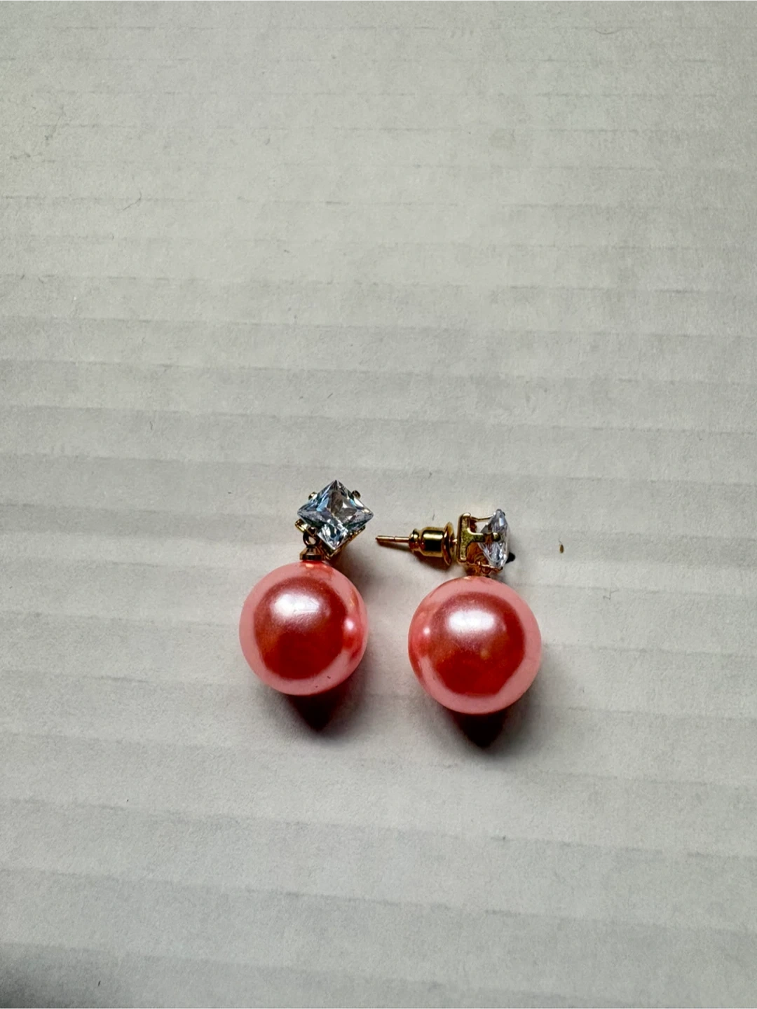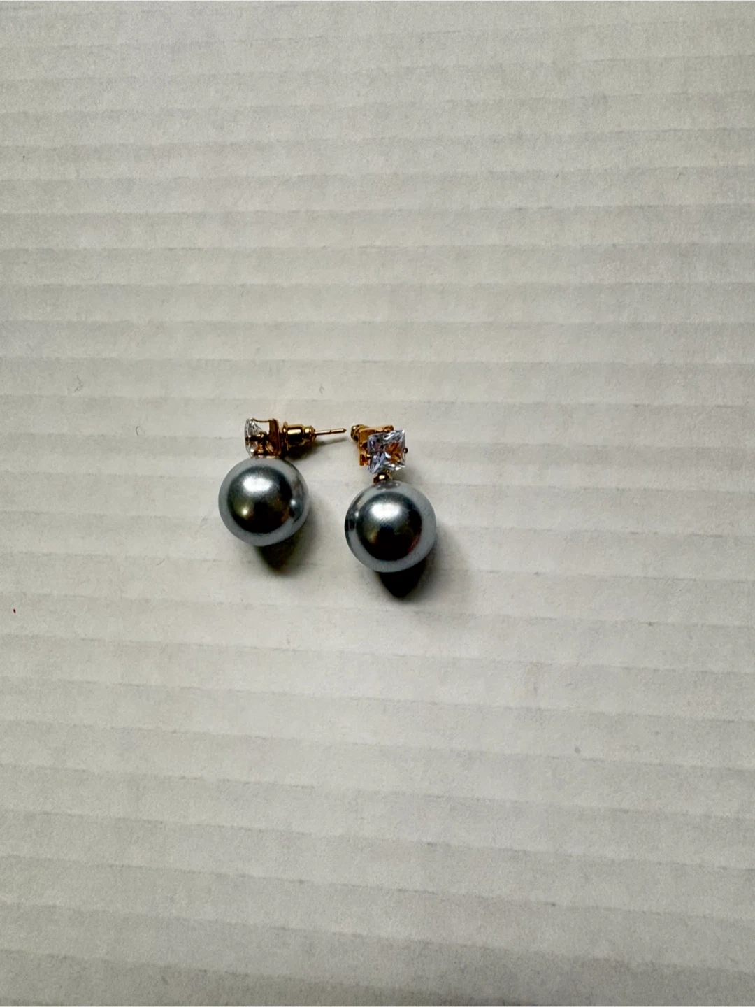 A collection of four pairs of fashion earrings. Includes oval-shaped earrings with black and gold accents and clear stones, as well as pearl-style stud earrings in grey, black, and pink. These are costume jewelry pieces. 5$ each