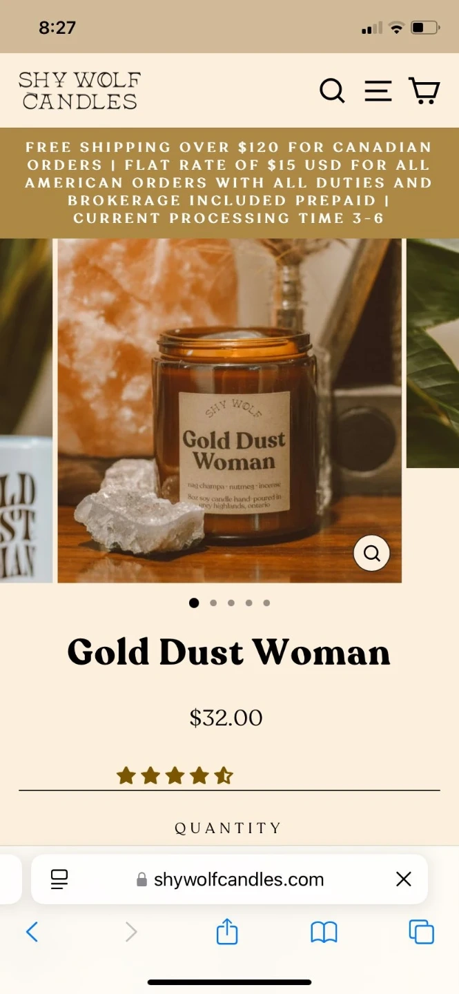 *PRICE IS FIRM* Selling a Shy Wolf Gold Dust Woman candle! This 8oz soy candle is hand-poured in Grey Highlands, Ontario. It has a lovely scent of nag champa, nutmeg, and incense