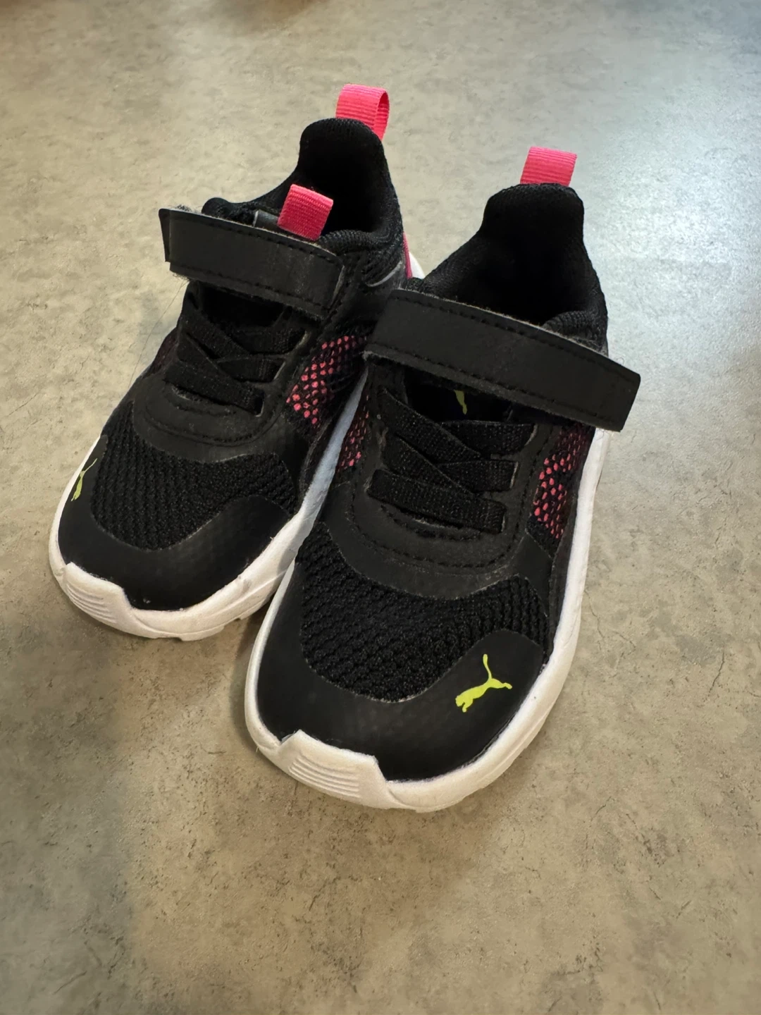 Puma running shoes for toddlers in black and pink. These shoes feature a hook-and-loop closure for easy on and off. Made with breathable mesh upper and a durable rubber sole. Perfect for active little ones!