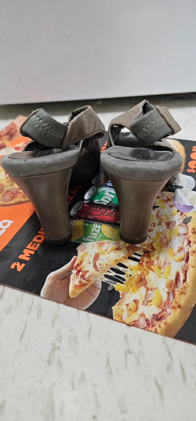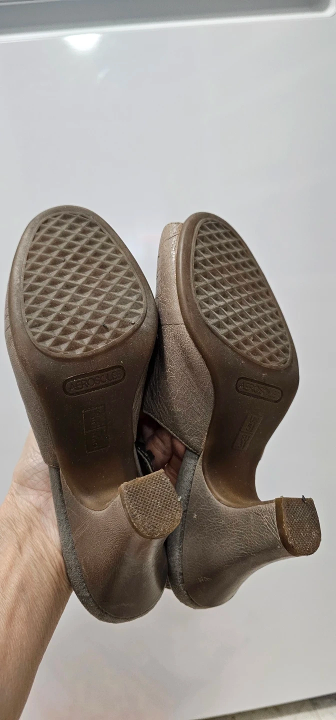 Aerosoles heeled sandals in a neutral grey colour. Features a textured leather-look material and an ankle strap closure. Heel height is approximately 3 inches.