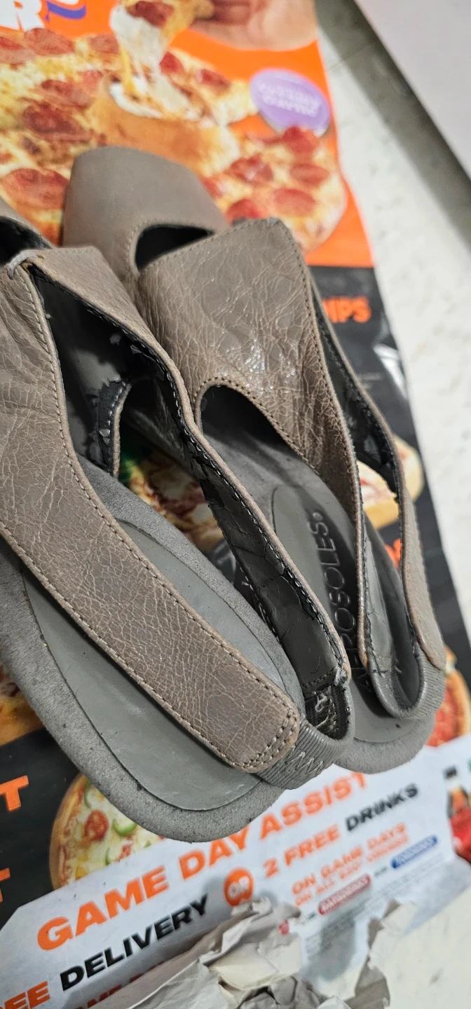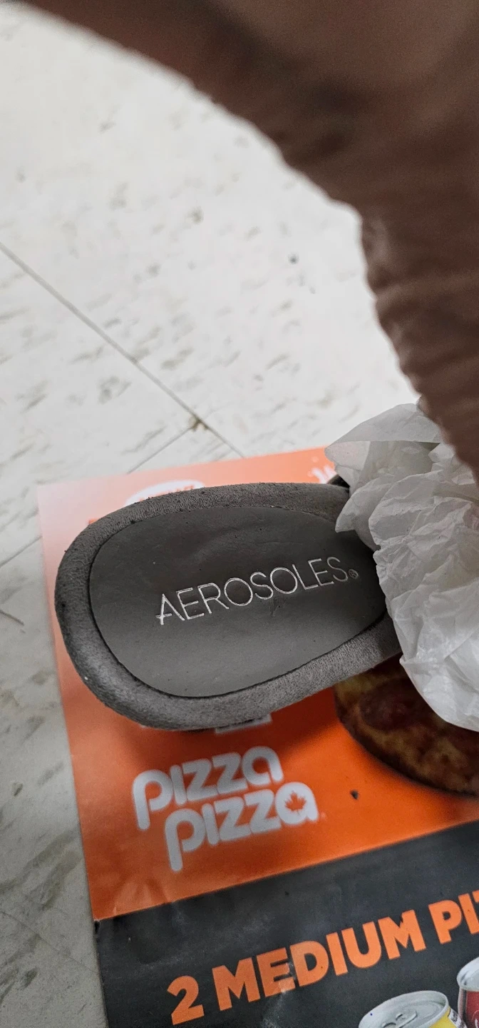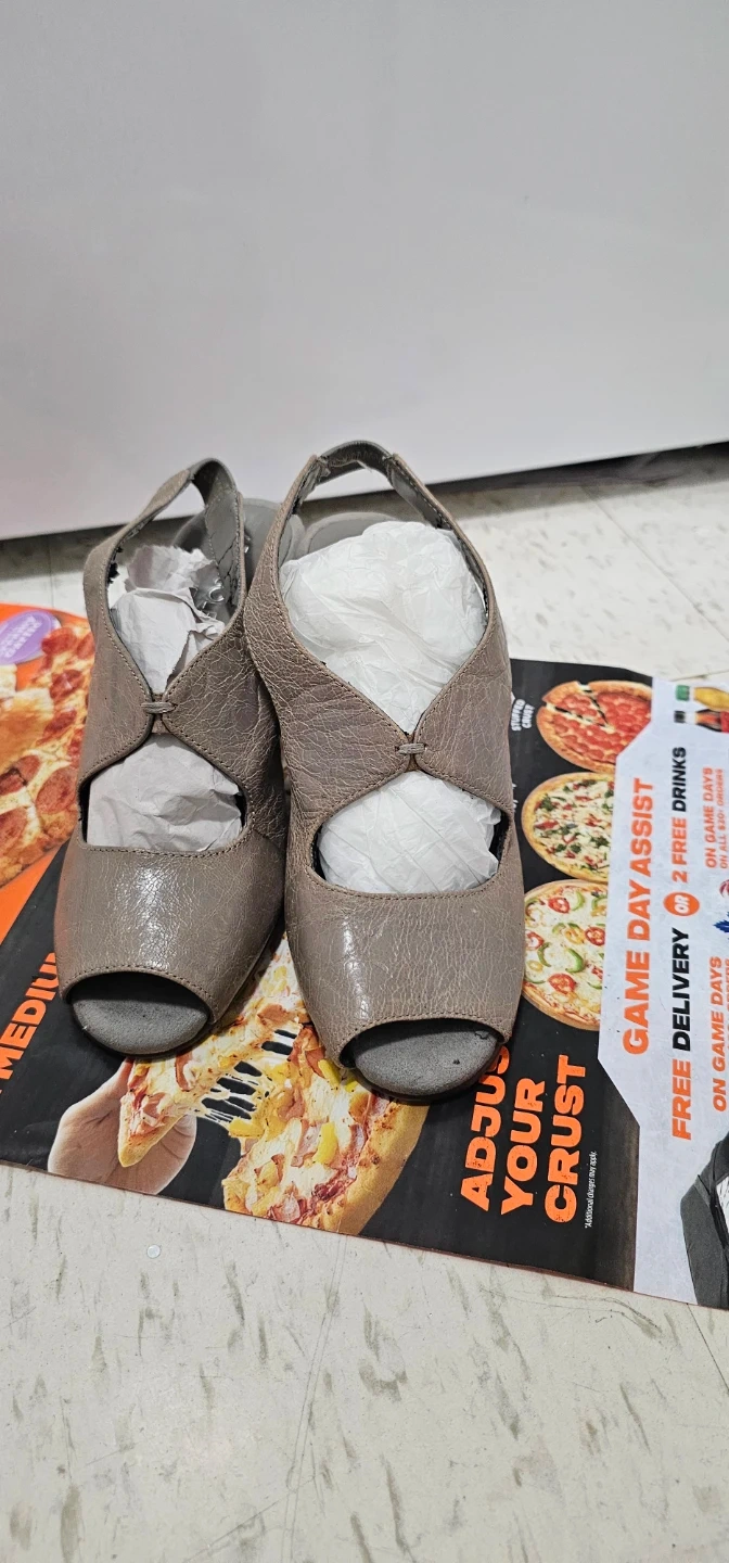 Aerosoles heeled sandals in a neutral grey colour. Features a textured leather-look material and an ankle strap closure. Heel height is approximately 3 inches.