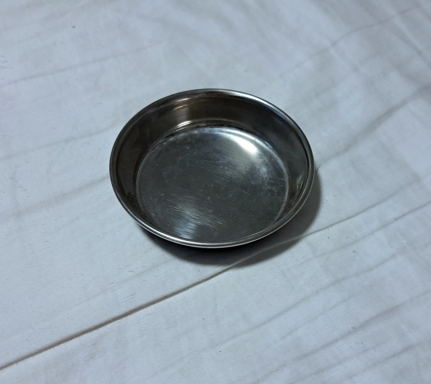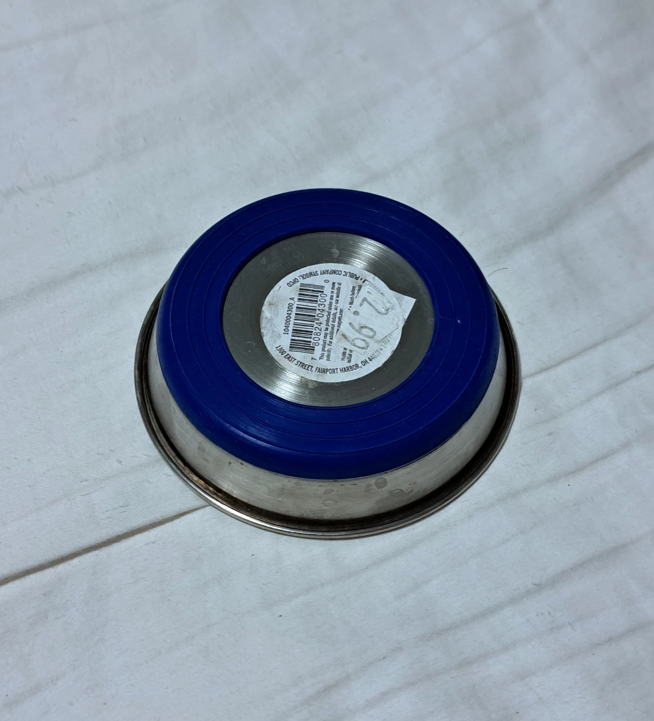 A small, sturdy stainless steel pet bowl with a blue rubber base. It's great for food or water for your furry friend. The base prevents sliding and reduces noise during meal times!