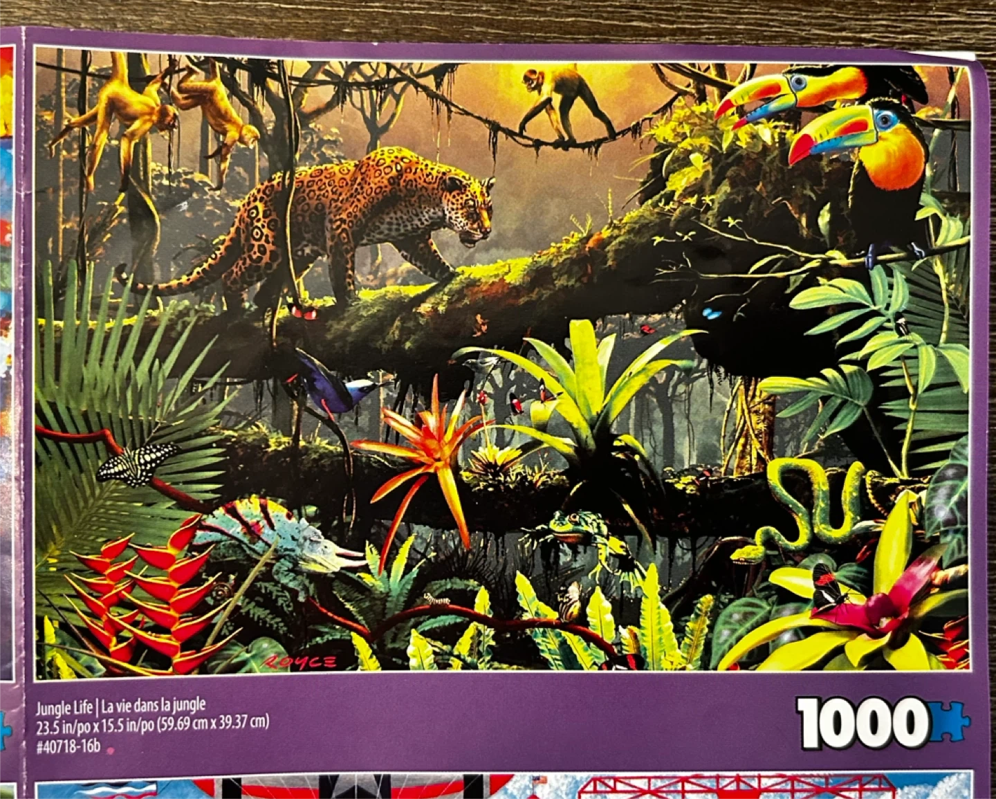 Two 1000-piece puzzles are included: 'Jungle Life' and 'Downtown Street'. Each puzzle measures 23.5 in x 15.5 in. The pieces come in two separate sealed bags.