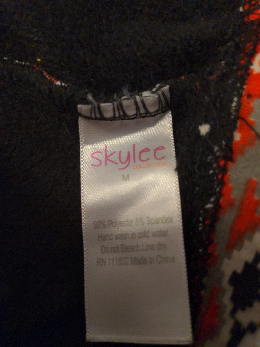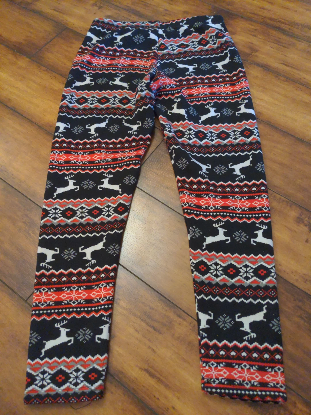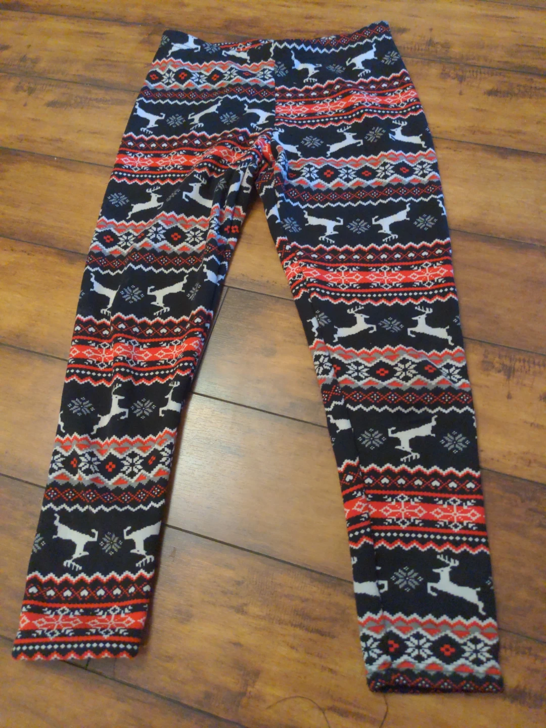Cozy leggings with a festive holiday pattern featuring reindeer and snowflakes. Made from 92% polyester and 8% spandex. Hand wash in cold water. Line dry.