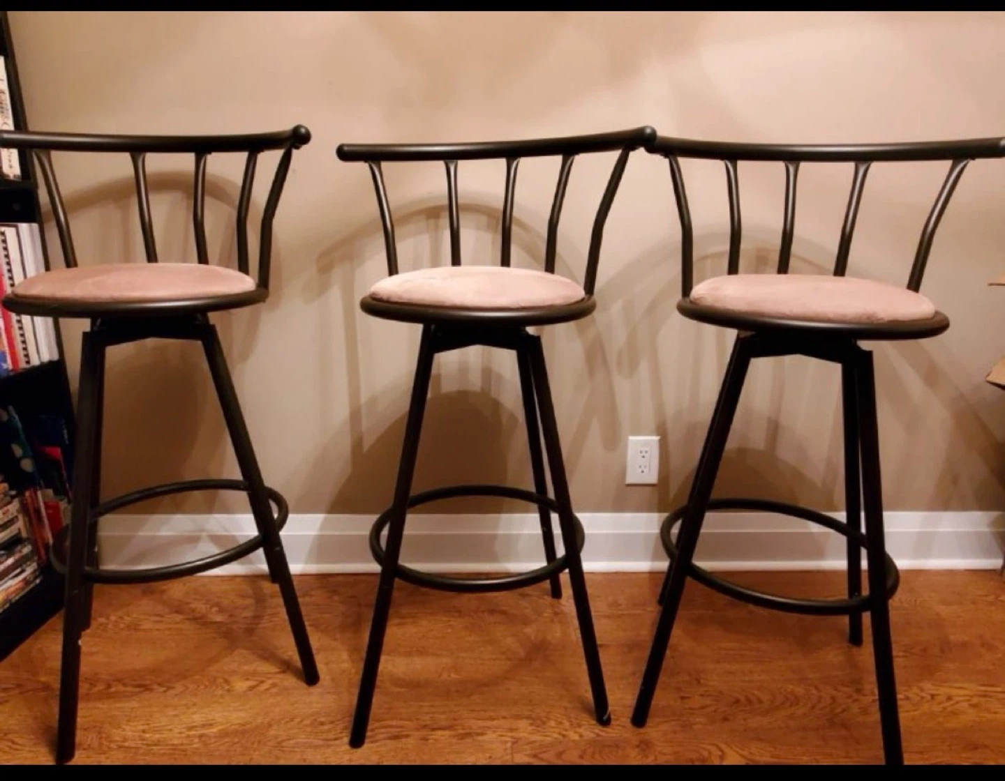 Three adjustable swivel bar stools with black metal frames and light pink upholstered seats. These stools offer a comfortable and stylish seating option for your kitchen counter or bar area. They're great for entertaining or everyday use! Able to rotate.