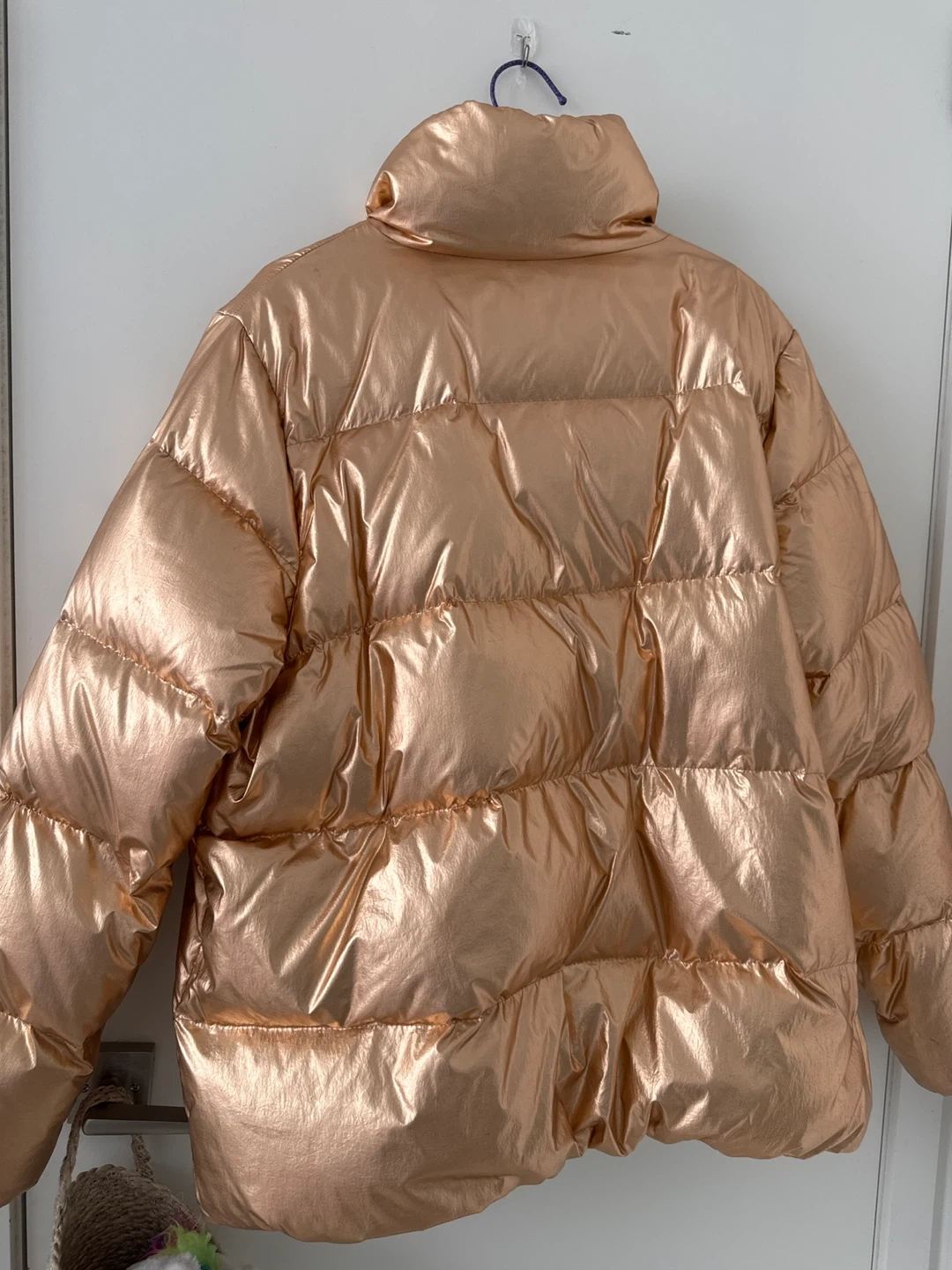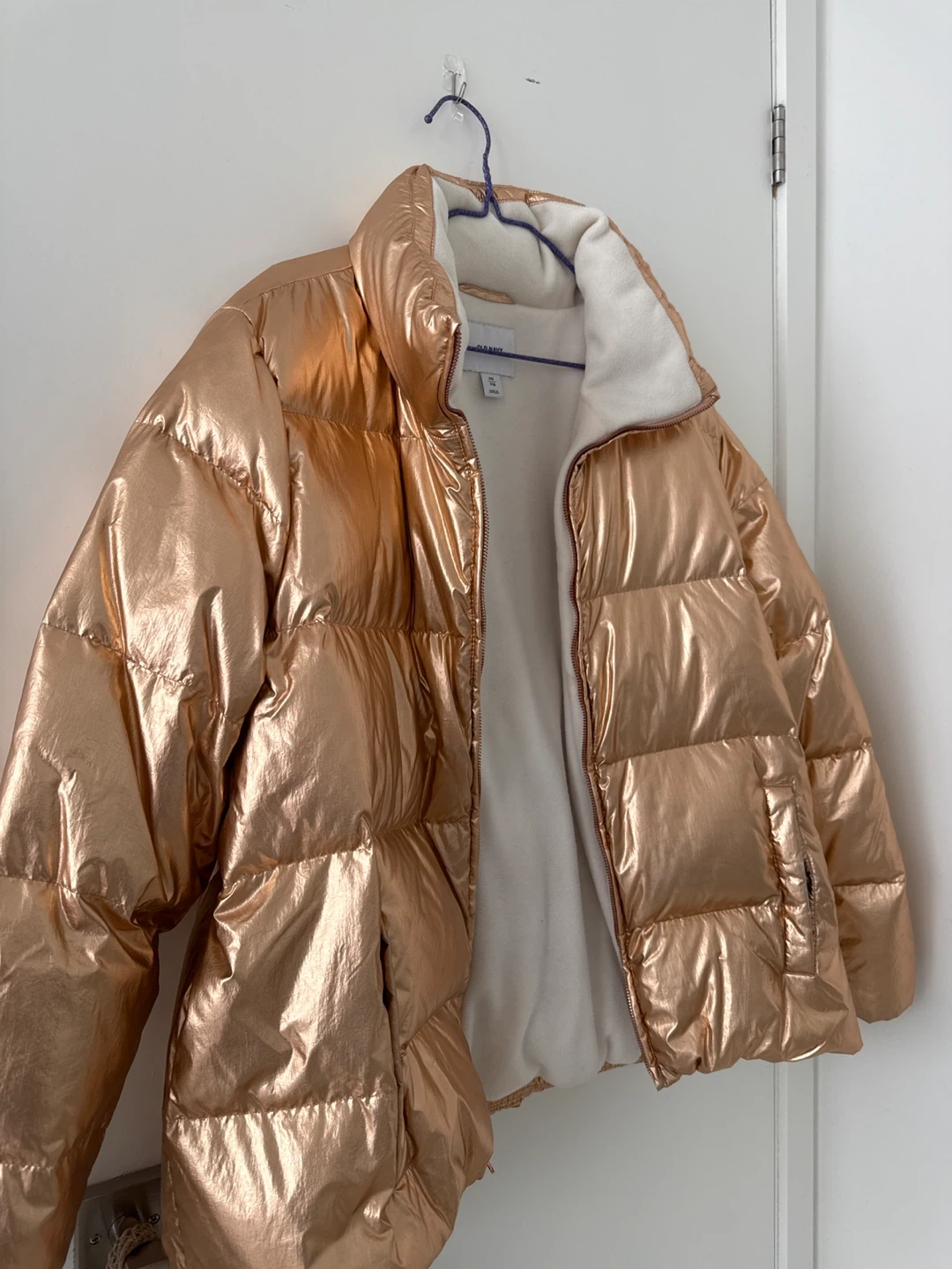 This is an Old Navy puffer jacket in a rose gold metallic finish. It's a size XXL and features a cozy fleece-lined interior. Perfect for staying warm and stylish!