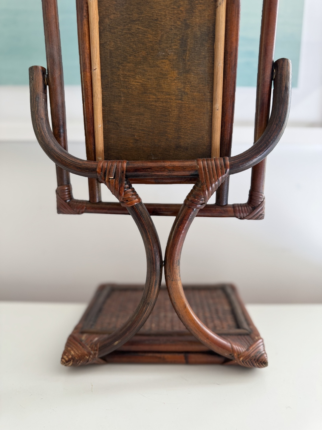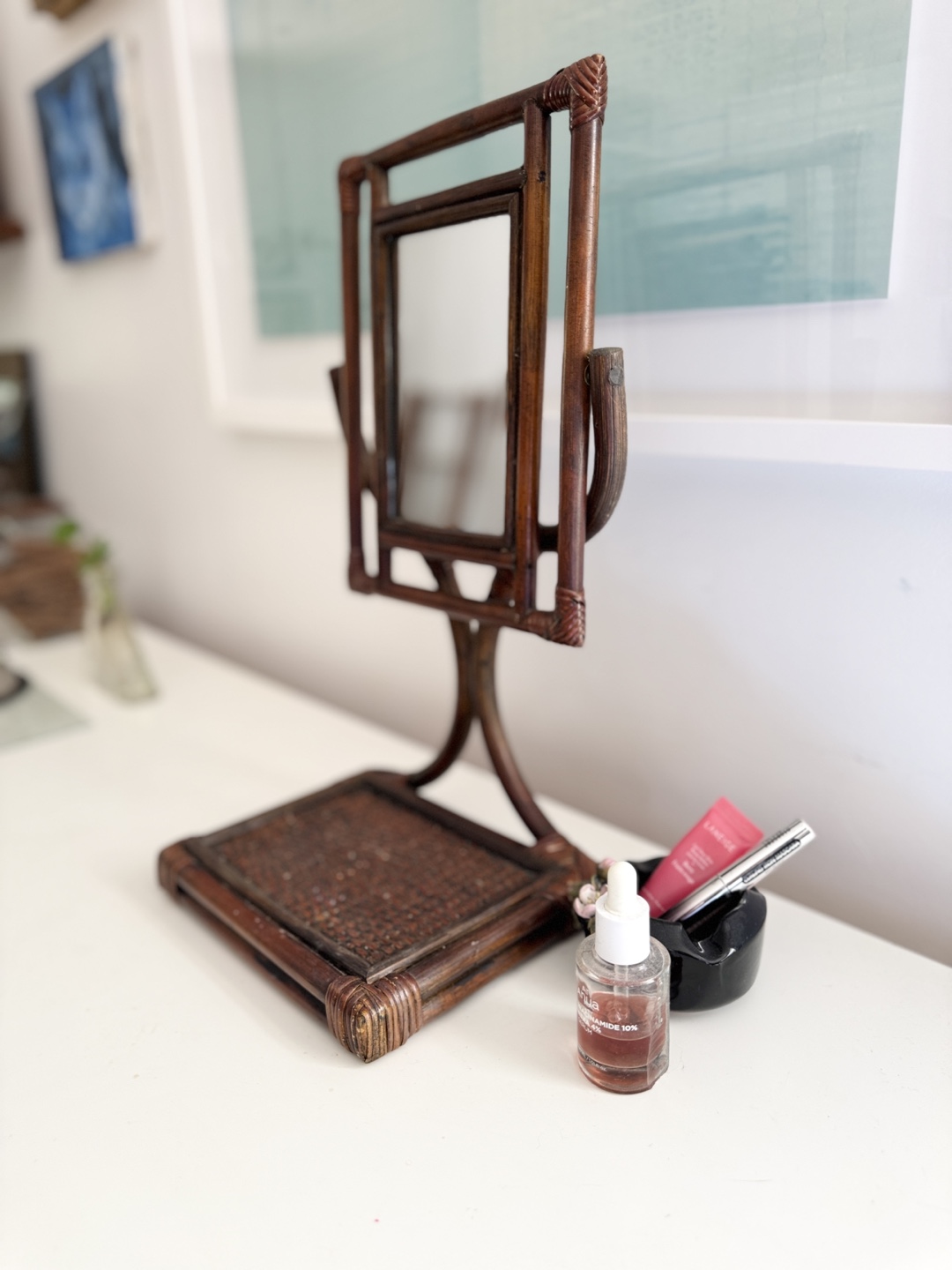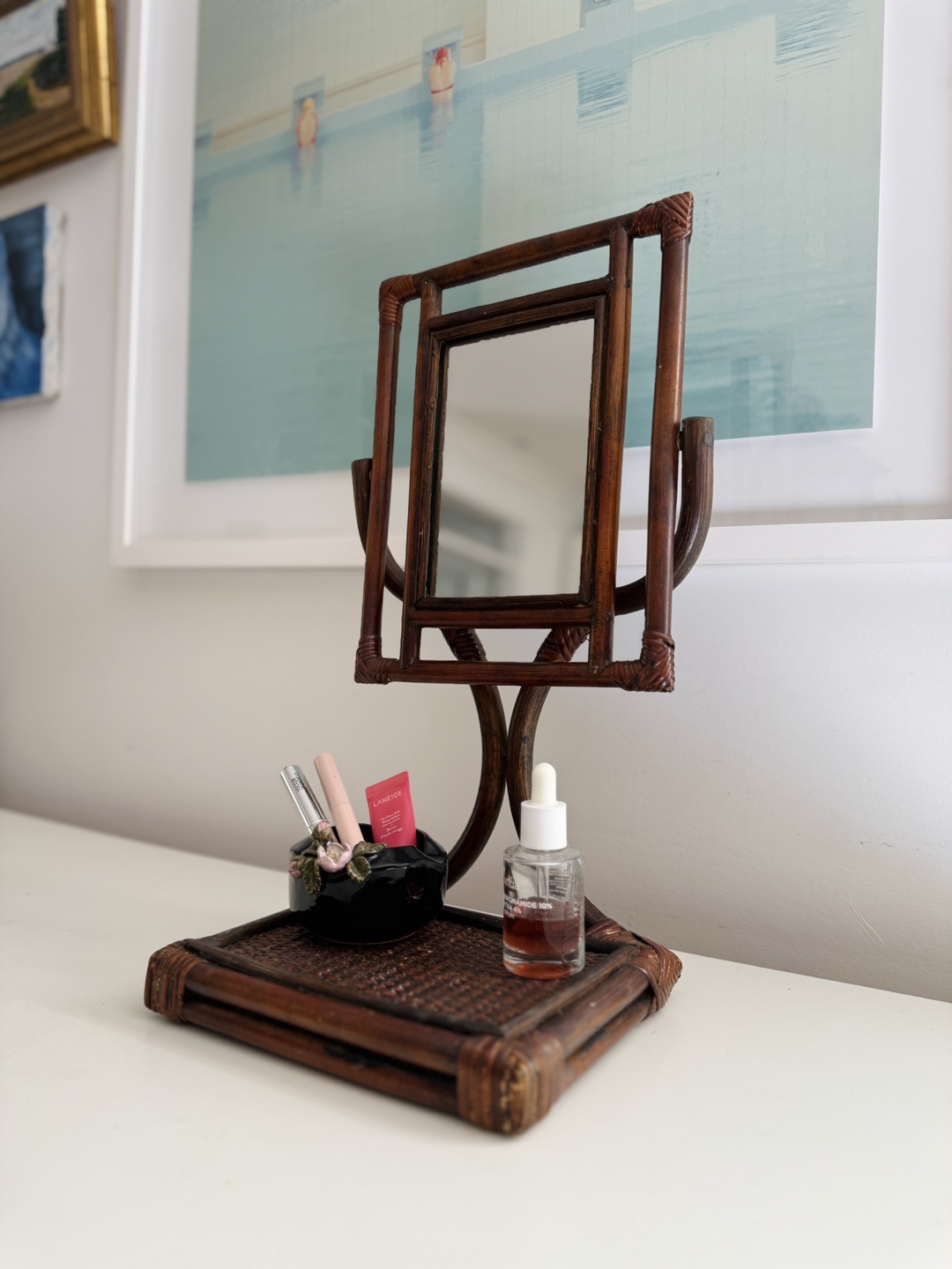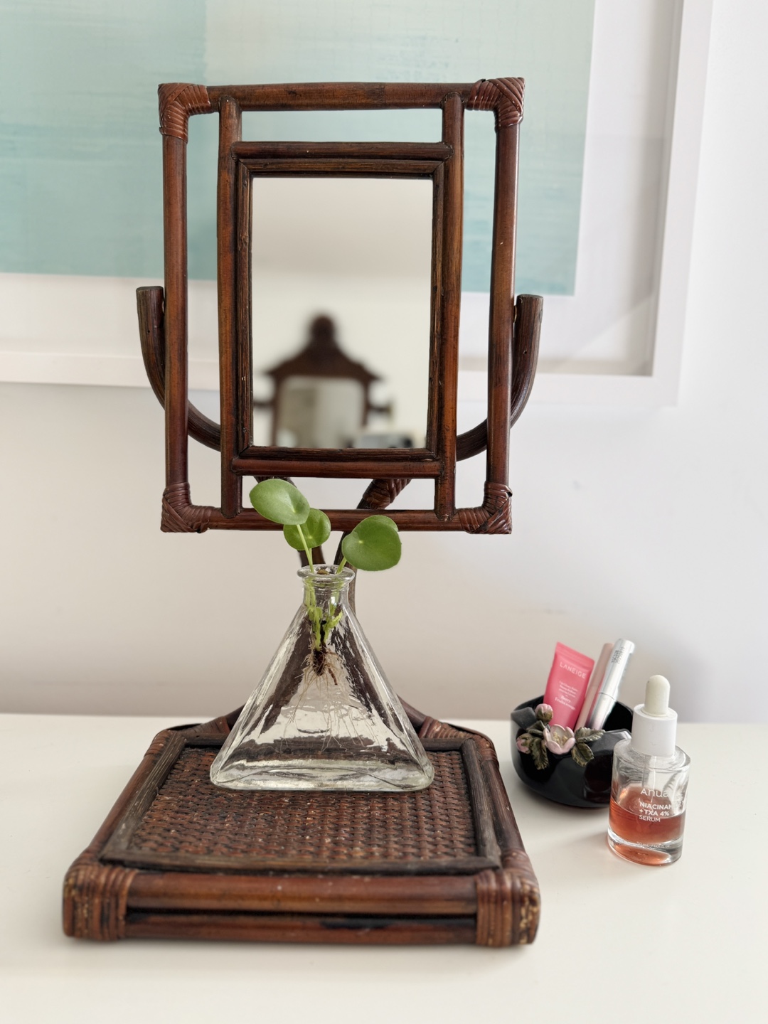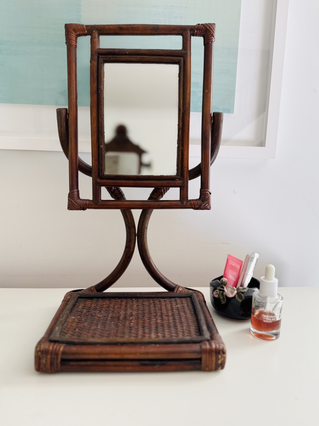 Vintage Rattan Swivel Mirror | Boho Wicker Vanity Tabletop Decor