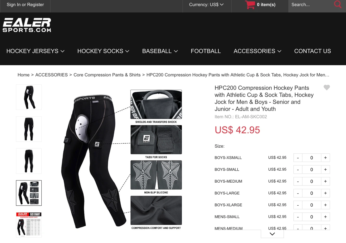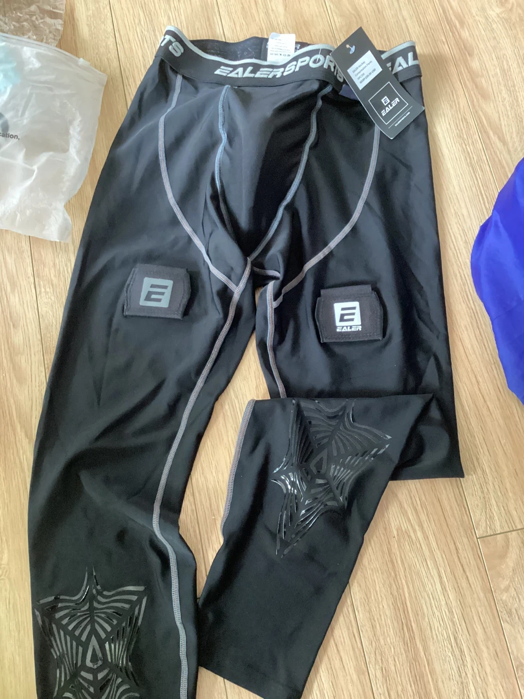 These new Mens large EALERSPORTS HPC200 compression hockey pants include an athletic cup and sock tabs. They're designed for hockey players needing comfort and support. Non-slip silicone at the leg openings keeps them in place.