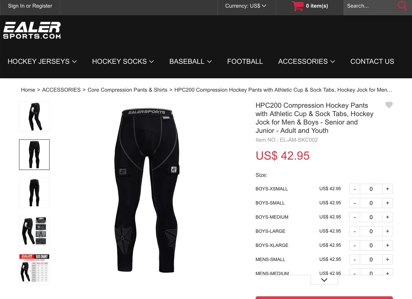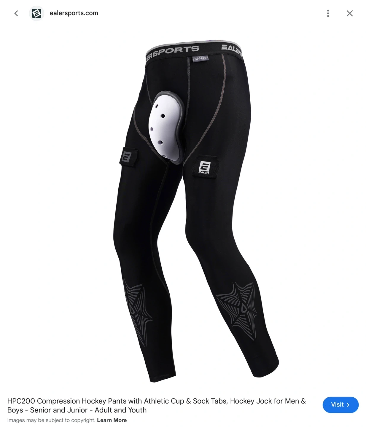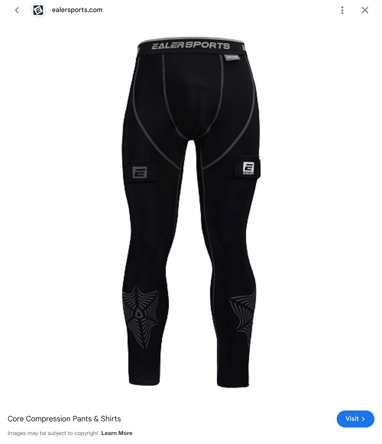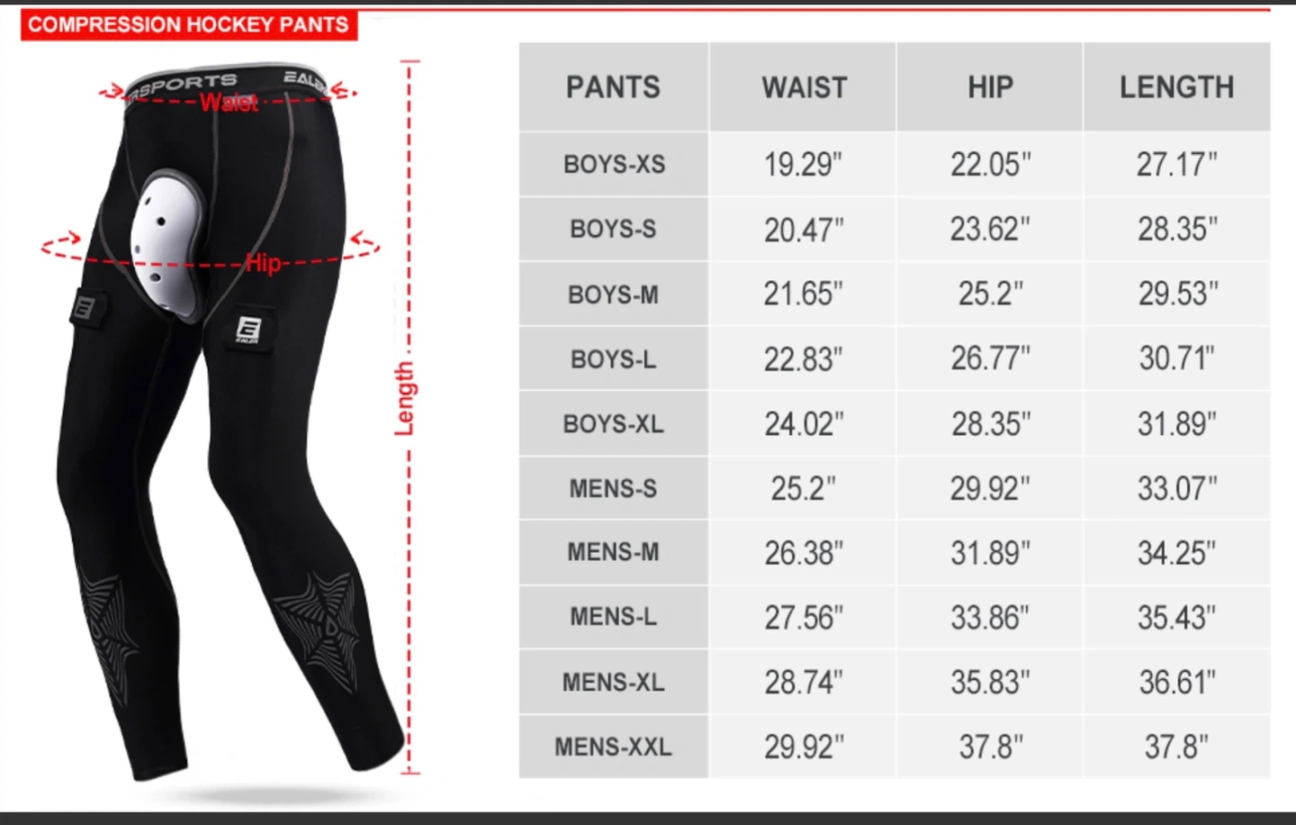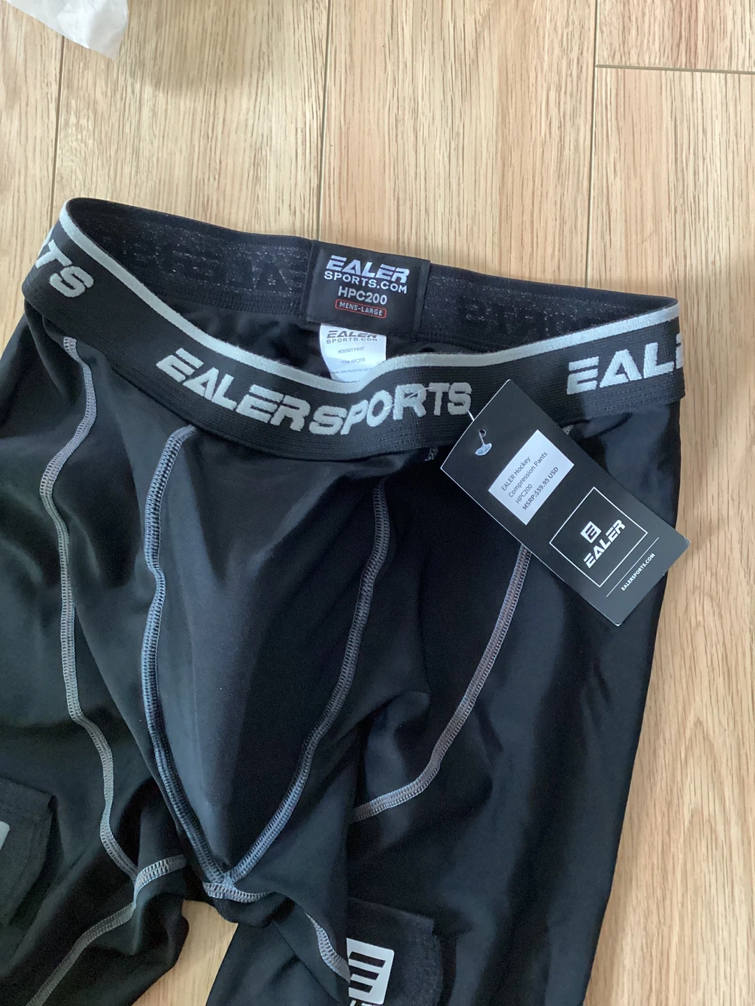 These new Mens large EALERSPORTS HPC200 compression hockey pants include an athletic cup and sock tabs. They're designed for hockey players needing comfort and support. Non-slip silicone at the leg openings keeps them in place.