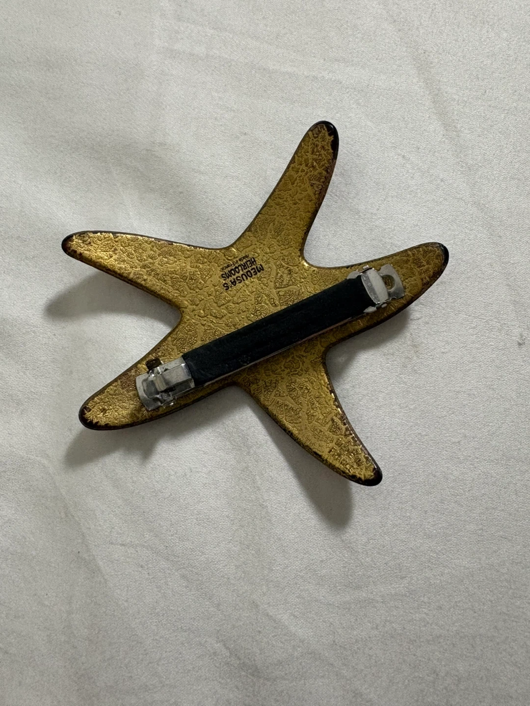 This is a decorative starfish hair clip from Medusa's Heirlooms. It features a gold-toned, textured finish with a dark amber-colored overlay. The clip mechanism appears secure and functional.