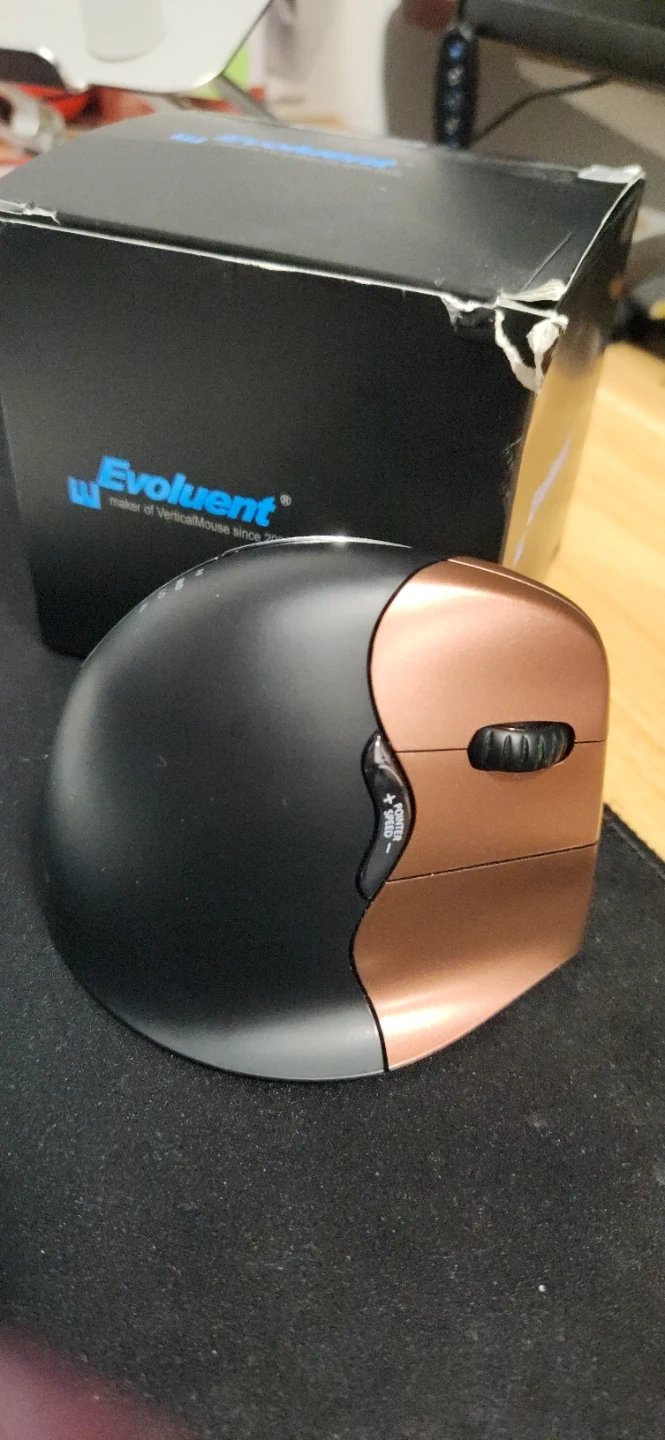 This is a small wireless vertical mouse from Evoluent. It's designed for comfortable, ergonomic use. It's a wireless mouse, model VerticalMouse 4 Small.