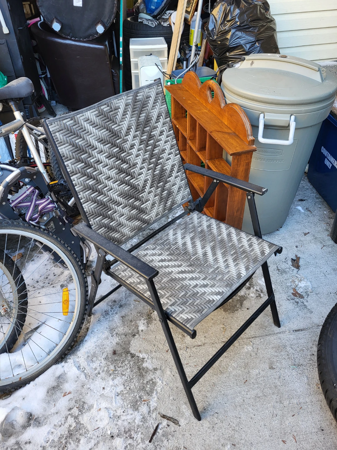Folding patio chair featuring a woven seat and back in grey and white. It's got a durable metal frame. This chair is great for quick outdoor seating needs.