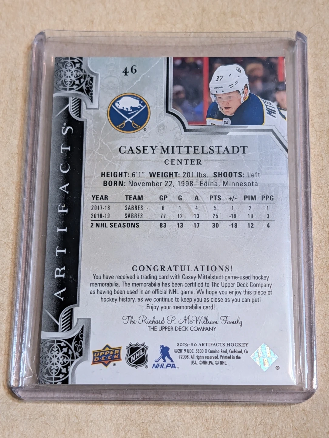 This is a 2019-20 Upper Deck Artifacts hockey trading card featuring Casey Mittelstadt. It includes game-used memorabilia swatches/patch. The card is numbered 49 out of 65. It's a collector's item for hockey fans.