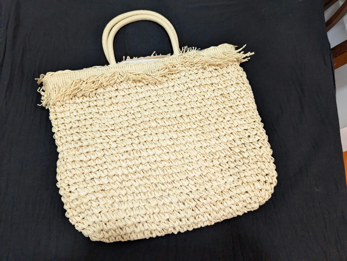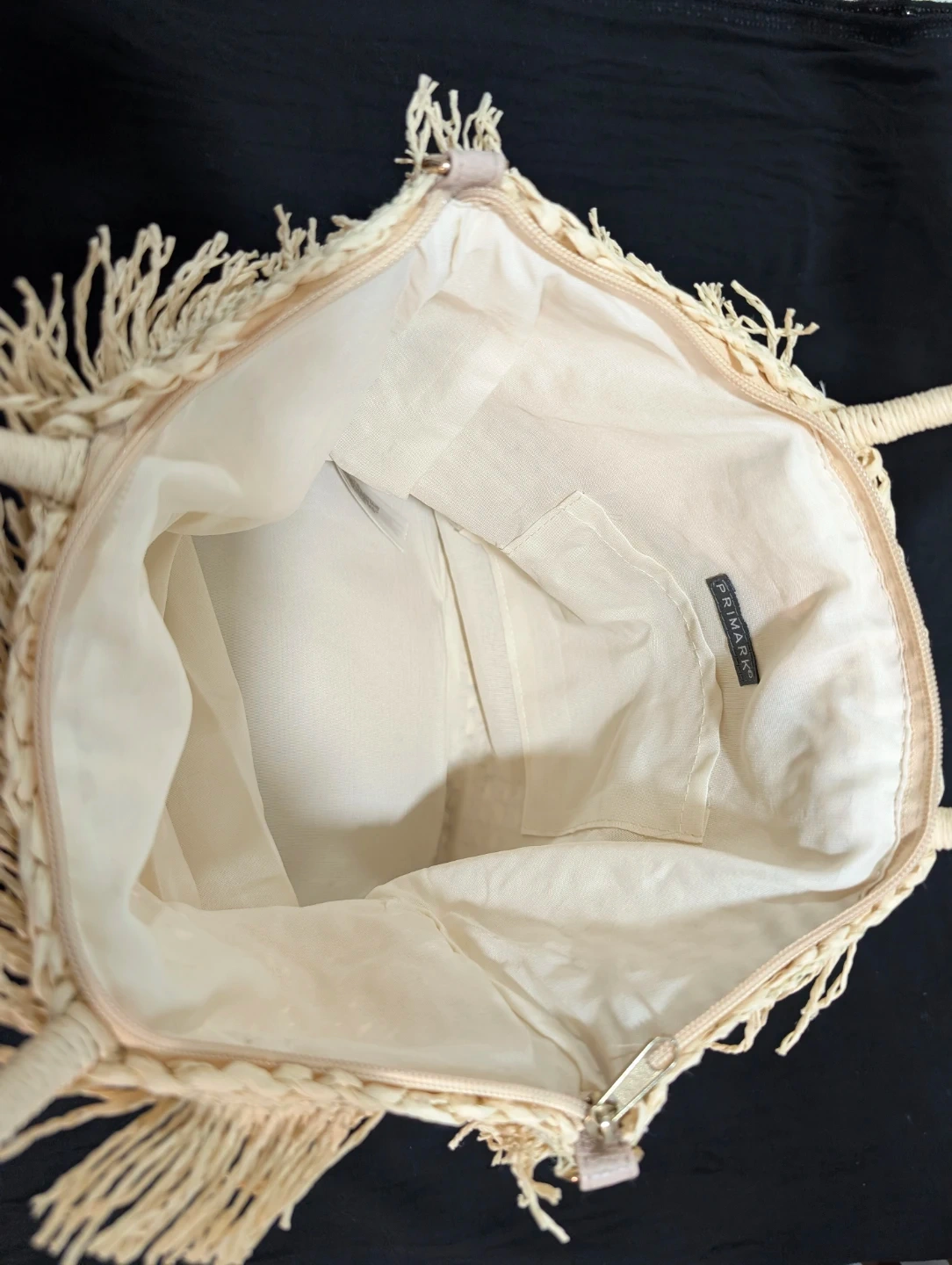 Looking to sell this cute woven straw beach bag with a fringed edge and round handle from Primark! It's in great condition and perfect for summer outings. It comes with a detachable strap for added convenience. The bag features a stylish fringe detail and is a great size for carrying all your essentials