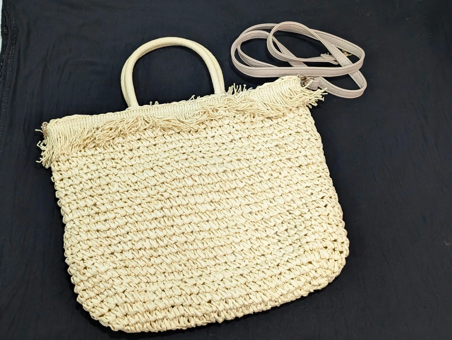 Looking to sell this cute woven straw beach bag with a fringed edge and round handle from Primark! It's in great condition and perfect for summer outings. It comes with a detachable strap for added convenience. The bag features a stylish fringe detail and is a great size for carrying all your essentials