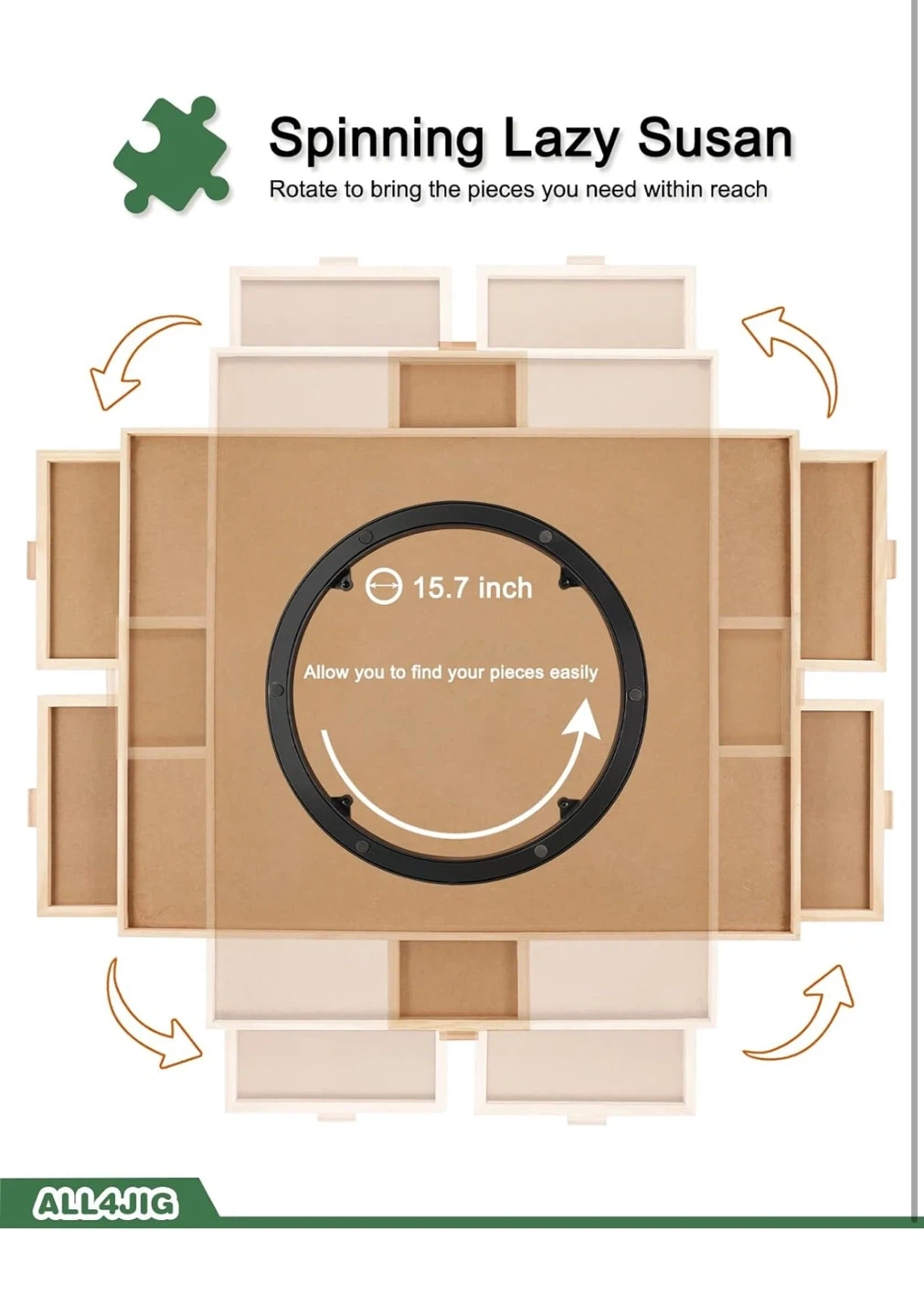 This ALL4JIG puzzle board features 6 sliding drawers for sorting your puzzle pieces. It includes a protective cover to keep your work safe. The board itself is a Lazy Susan for easy rotation and piece access.