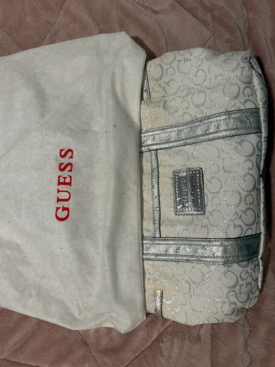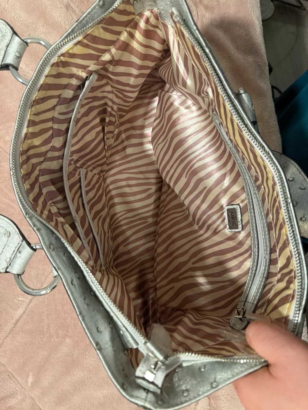 This is a Guess tote bag with a white and silver monogram pattern. It features a zebra-print interior lining and multiple pockets. Includes original dust bag.
