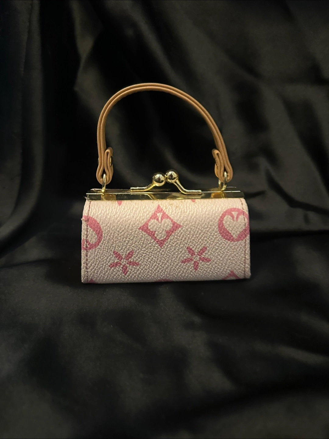 Adorable mini handbag. Features a top handle and clasp closure. Pink and beige colour scheme. Perfect for carrying essentials, change or as a decorative piece.