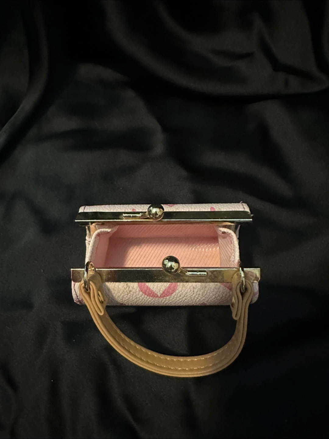 Adorable mini handbag. Features a top handle and clasp closure. Pink and beige colour scheme. Perfect for carrying essentials, change or as a decorative piece.