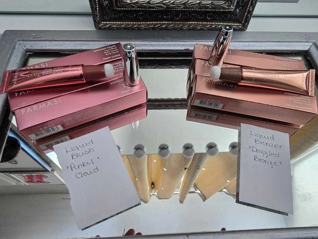 NIP Midnight Touch liquid bronzer and blush, tube with sponge applicator. Convenient and easy to apply, these shades are stunning. I have the following left in stock, at only $5.00 each: (3) Blush in shade PINKY CLOUD, (3) Bronzer/highlighter in the shade DRIZZLED BRONZE. Pick up area Grantham/Carlton. From a very clean, smoke-free home. Please see my other ads, thank you.