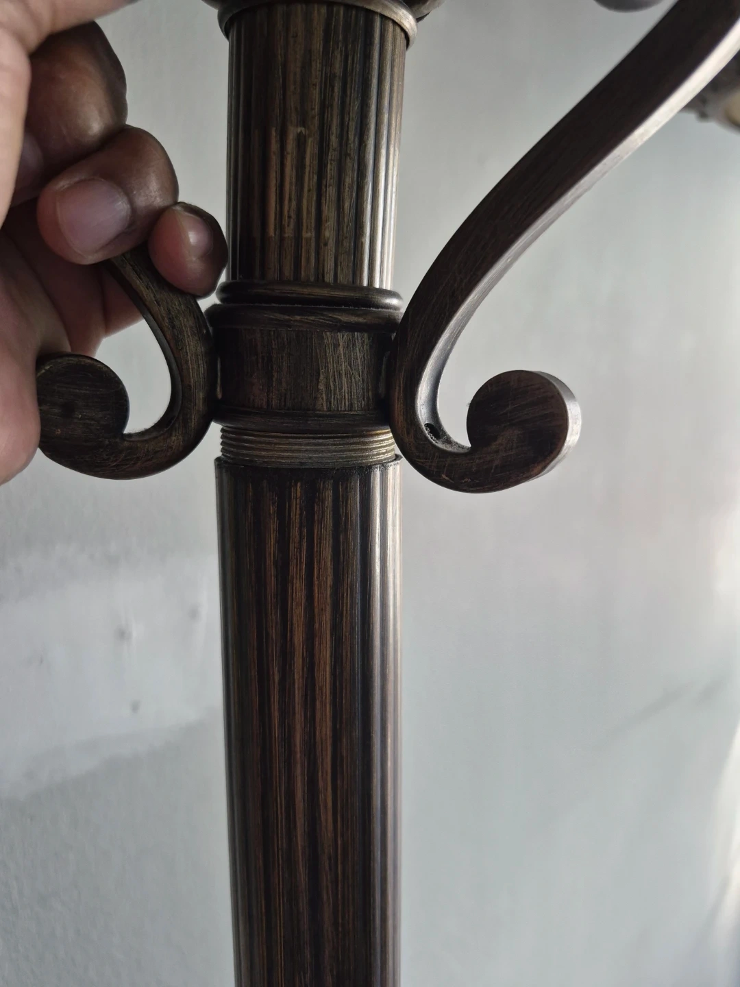 Selling a set of two floor lamps with a vintage-inspired design. They feature ornate bases and detailed columns in a bronze finish with frosted glass shades. These lamps add a touch of elegance to any room.