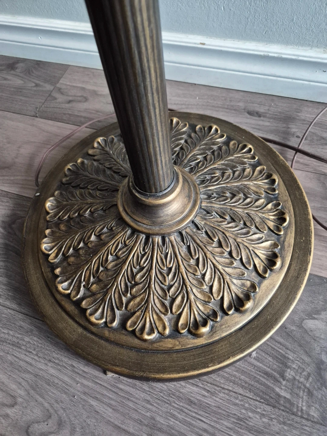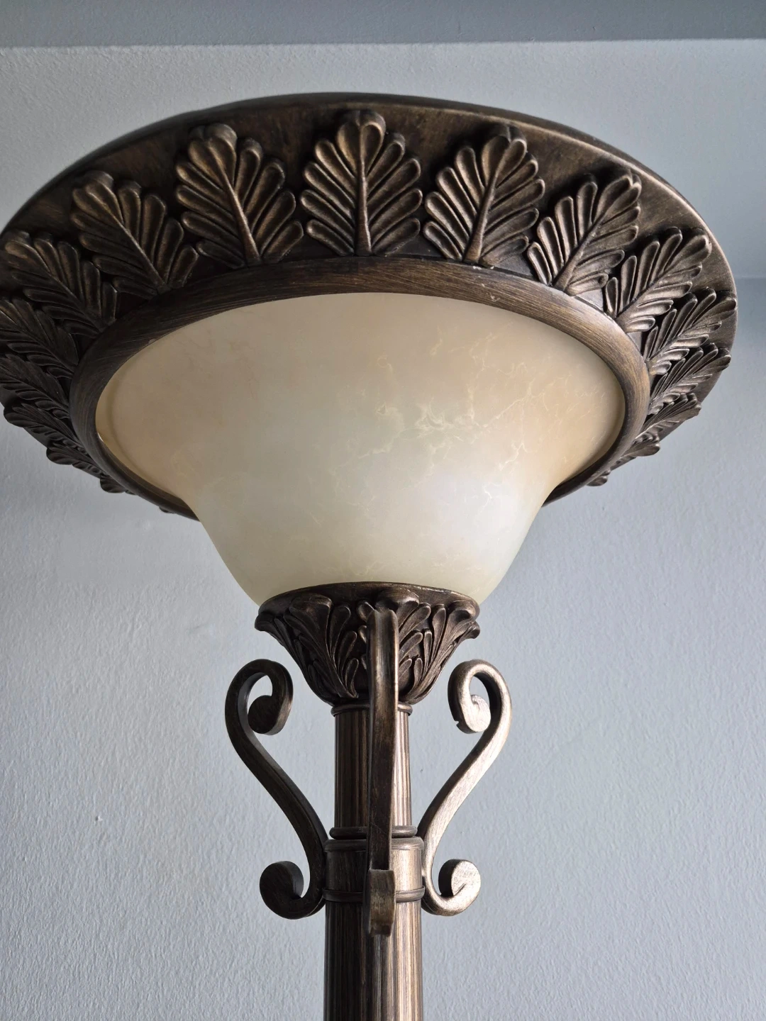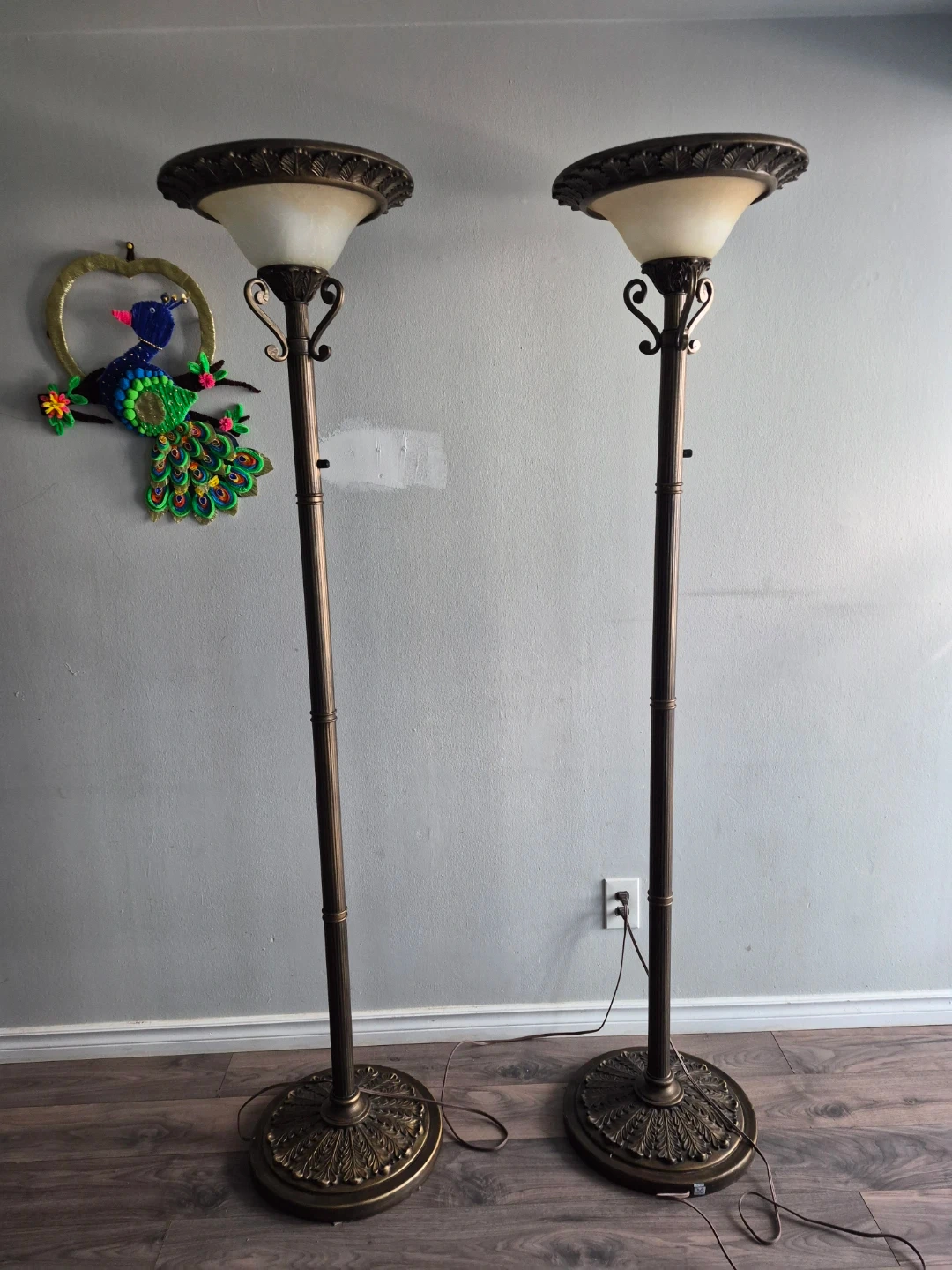 Selling a set of two floor lamps with a vintage-inspired design. They feature ornate bases and detailed columns in a bronze finish with frosted glass shades. These lamps add a touch of elegance to any room.