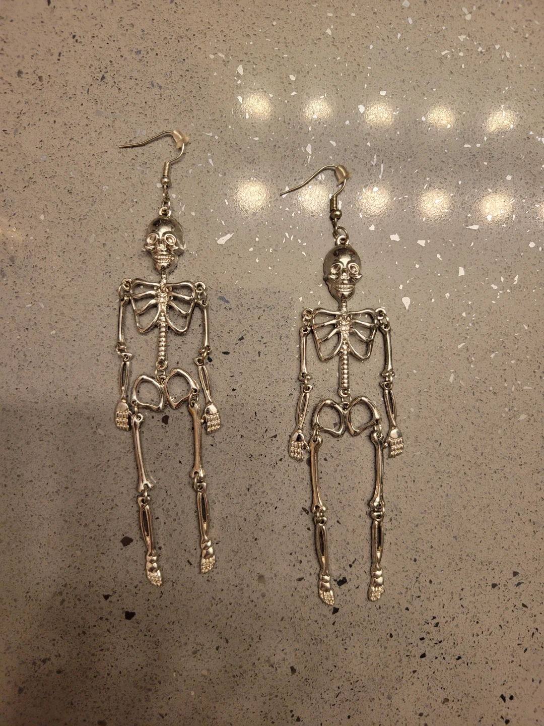 These are a pair of silver-toned skeleton dangle earrings. They're articulated to mimic movement. They're a fun accessory for Halloween or alternative fashion.