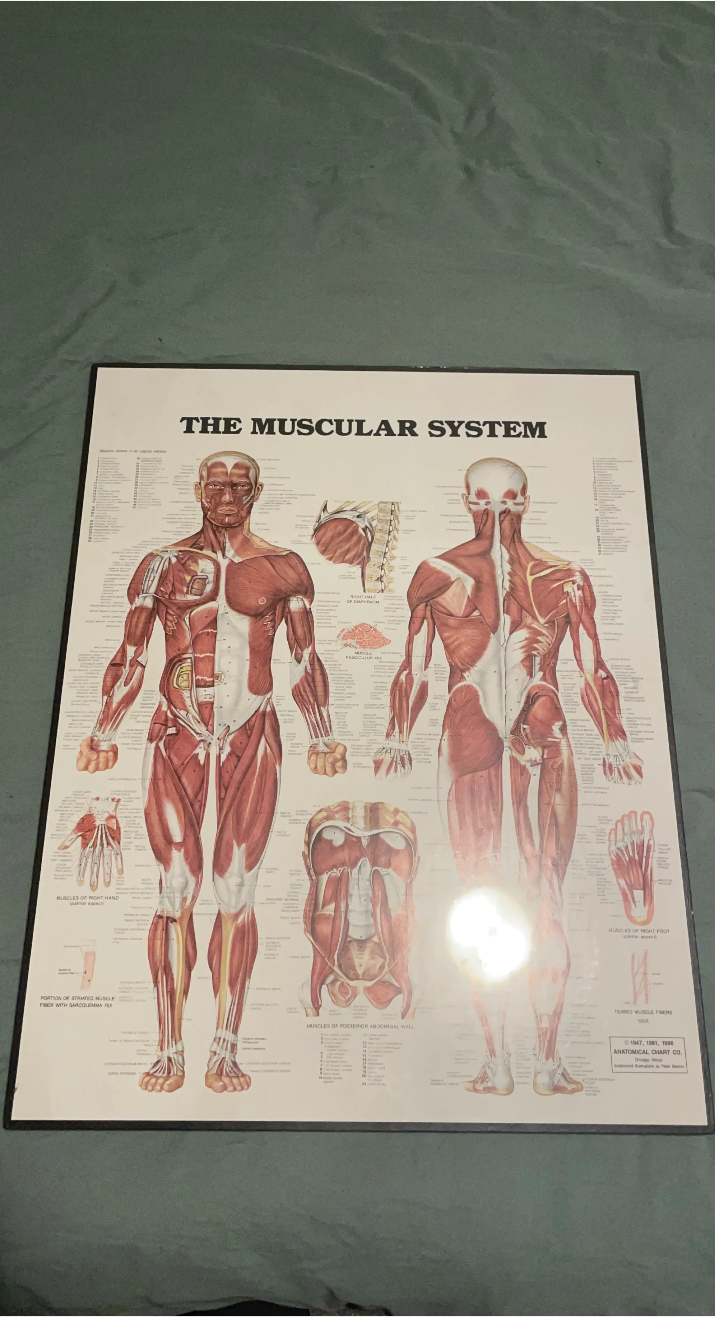 Anatomical Chart Co. poster detailing the muscular system. Illustrations are by Press Bachin. The chart includes detailed views of muscles in the hands, feet, and abdomen, as well as overall anterior and posterior views. It's dated 1947, 1981, 1986.