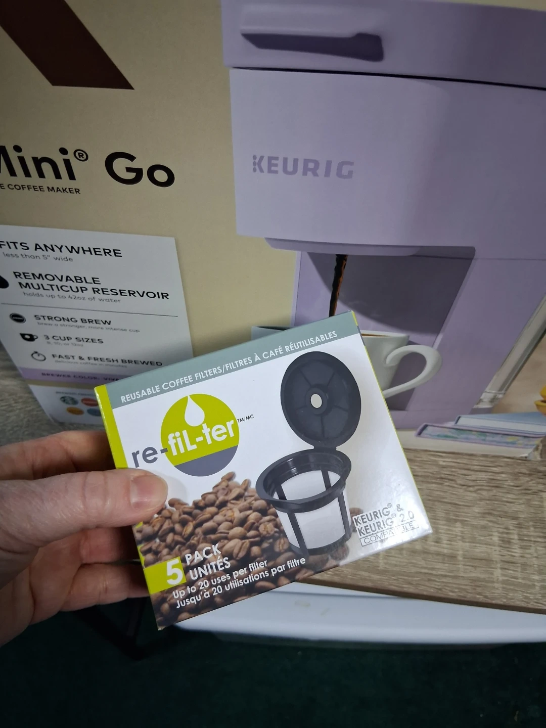 Comes with 5 reusable coffee filters, also new in unopened box - no need to buy k-cups!