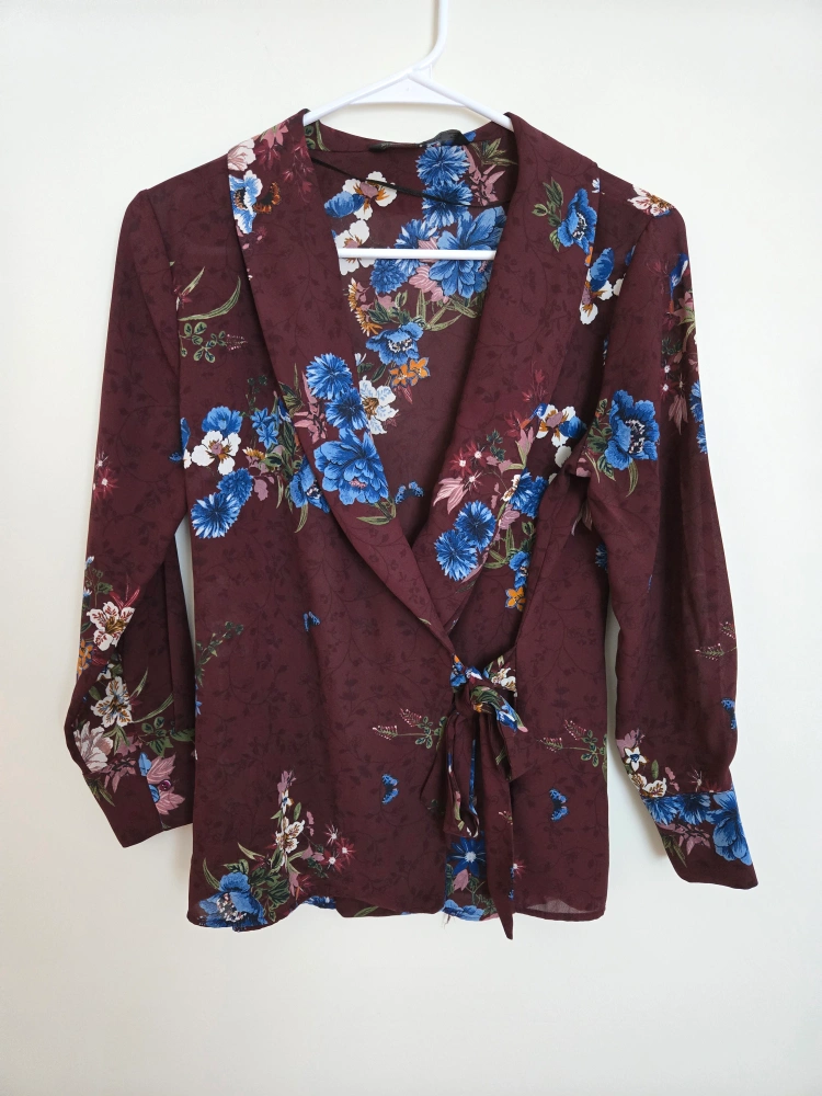 Zara Basic Collection blouse in size S. It features a beautiful floral pattern with a maroon base and blue, white, and pink flowers. Made in Morocco, this blouse is perfect for adding a touch of elegance to your wardrobe