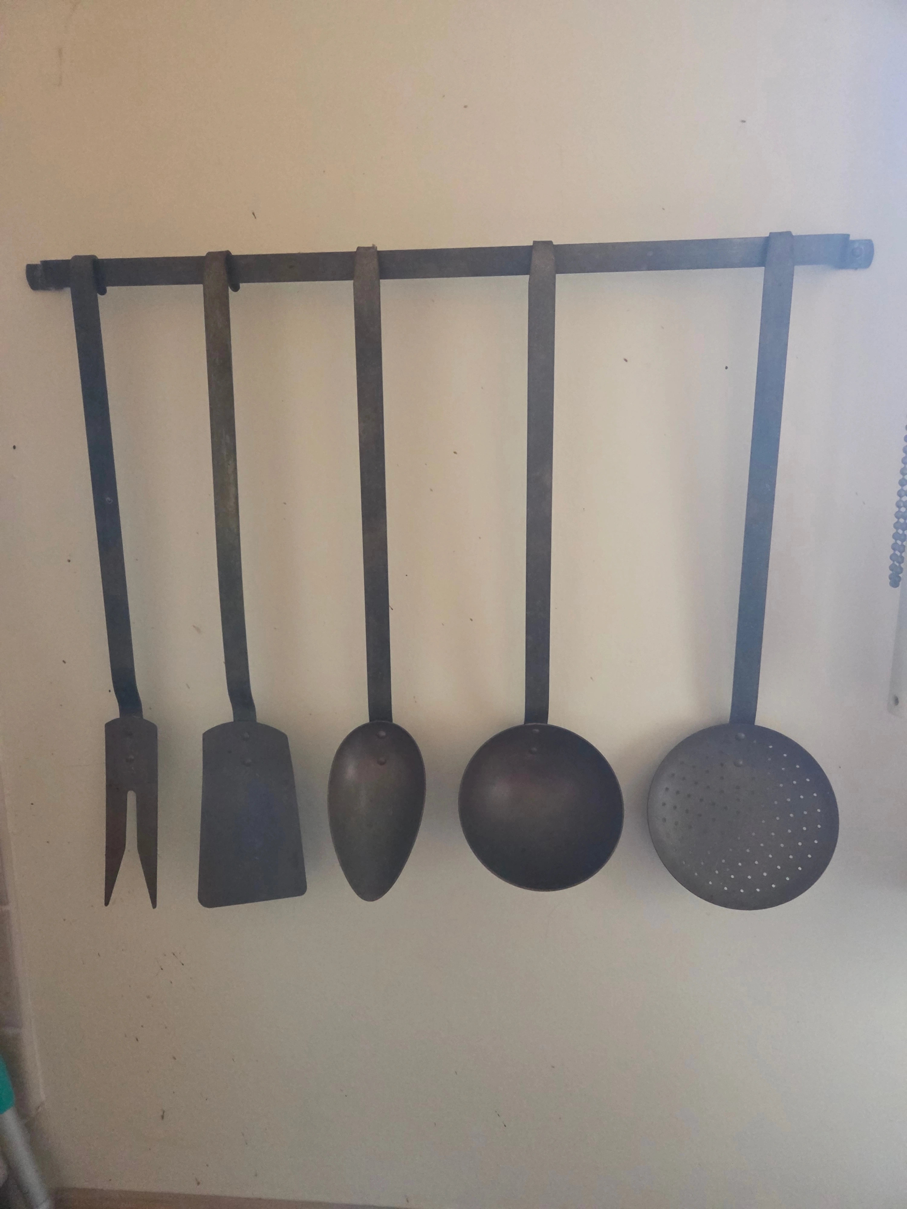 Rare Mid-Century Modern (1960s) kitchen utensil set. These feature solid brass/bronze heads with heavy, hand-forged wrought iron handles. This is a high-quality, heavy set—not a cheap reproduction.