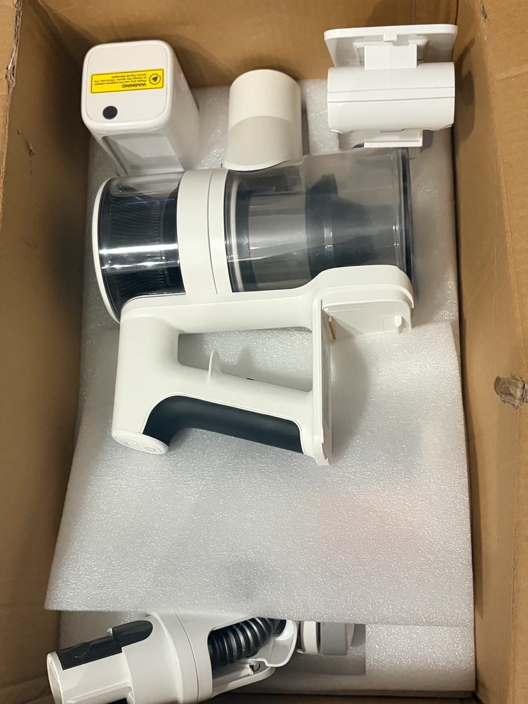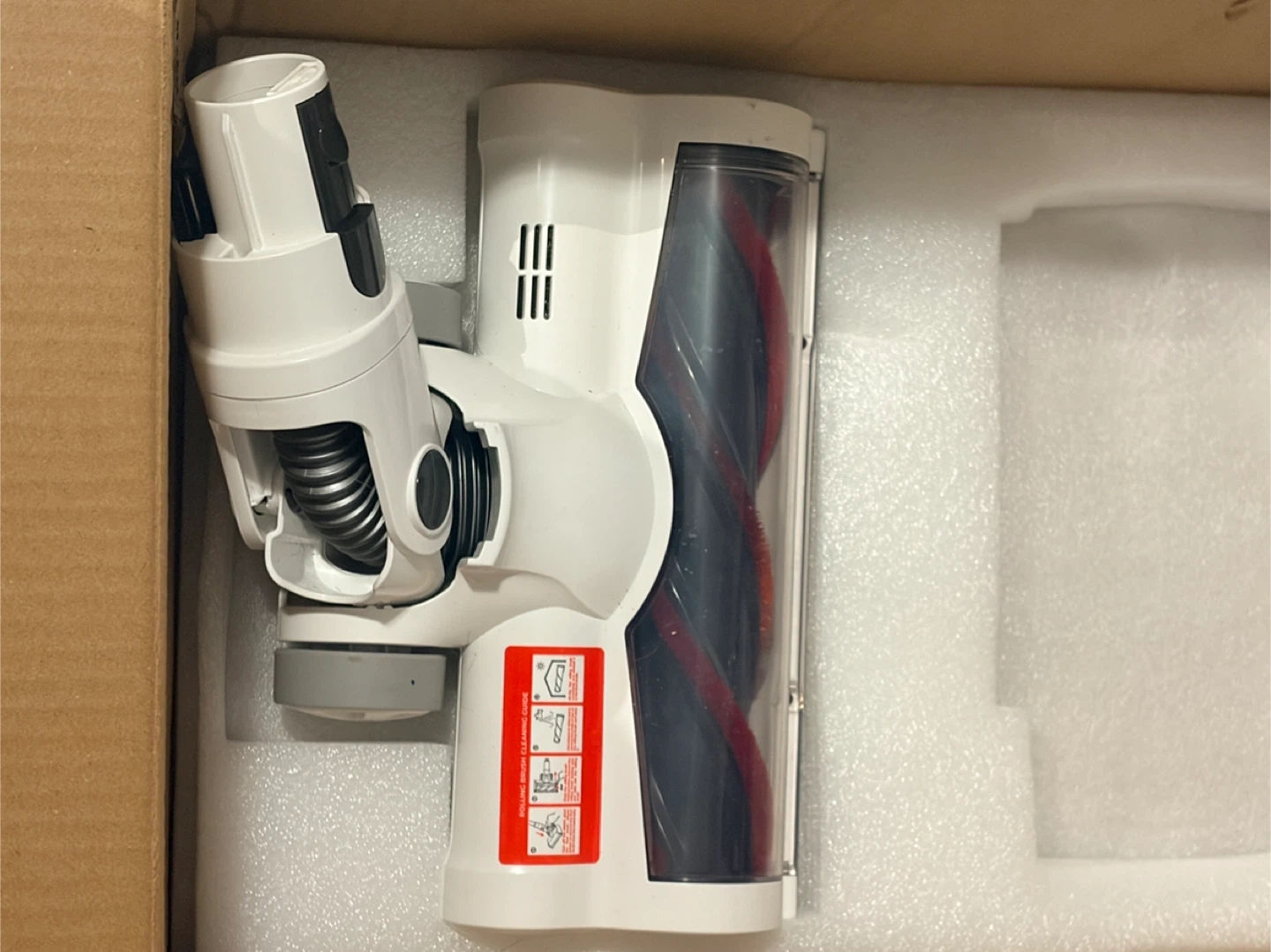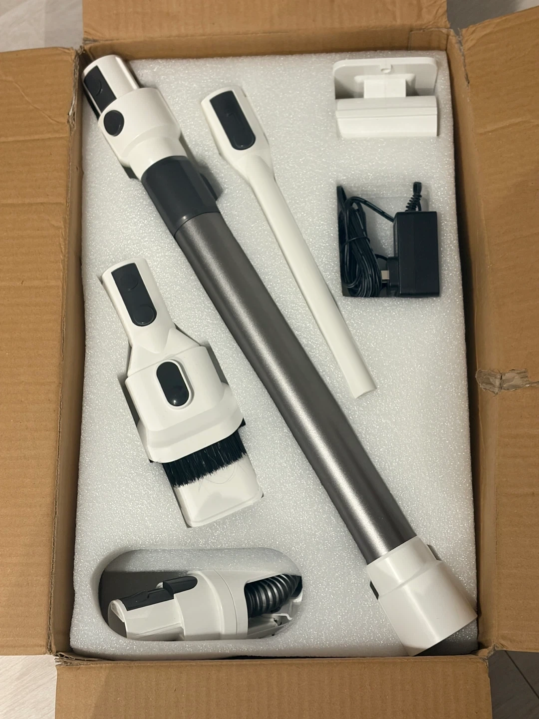 This is a cordless vacuum cleaner, model P11. It features a 140W motor and a 22.2V battery. Comes with various attachments and a charging adapter.