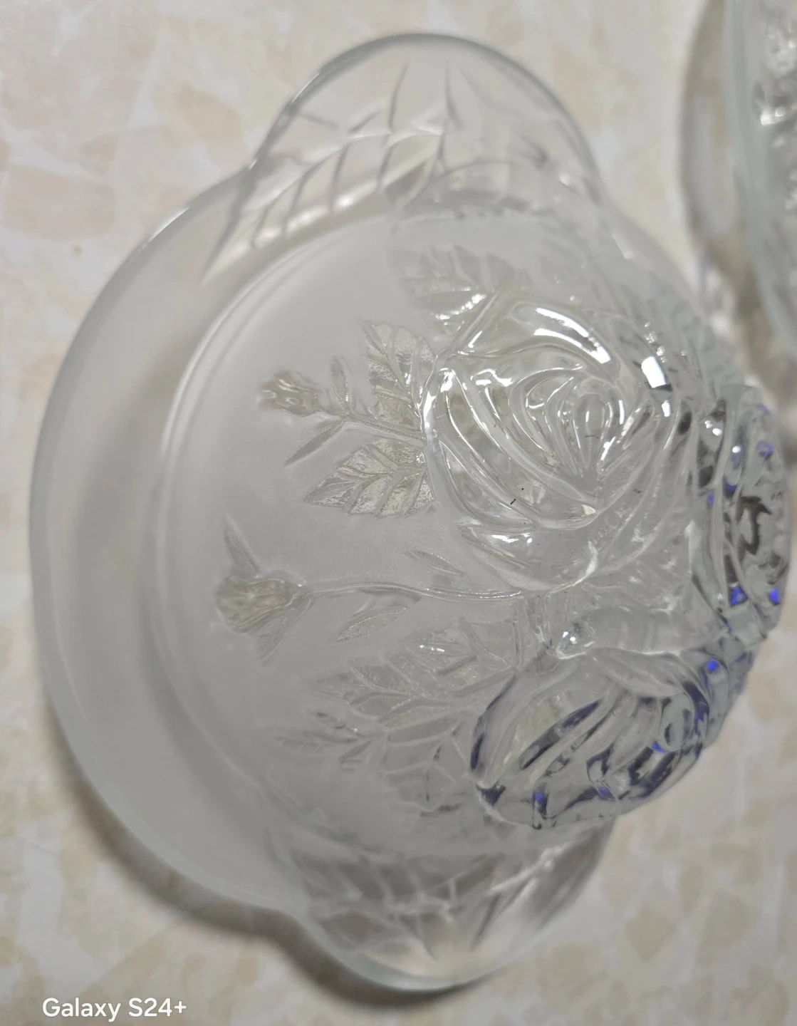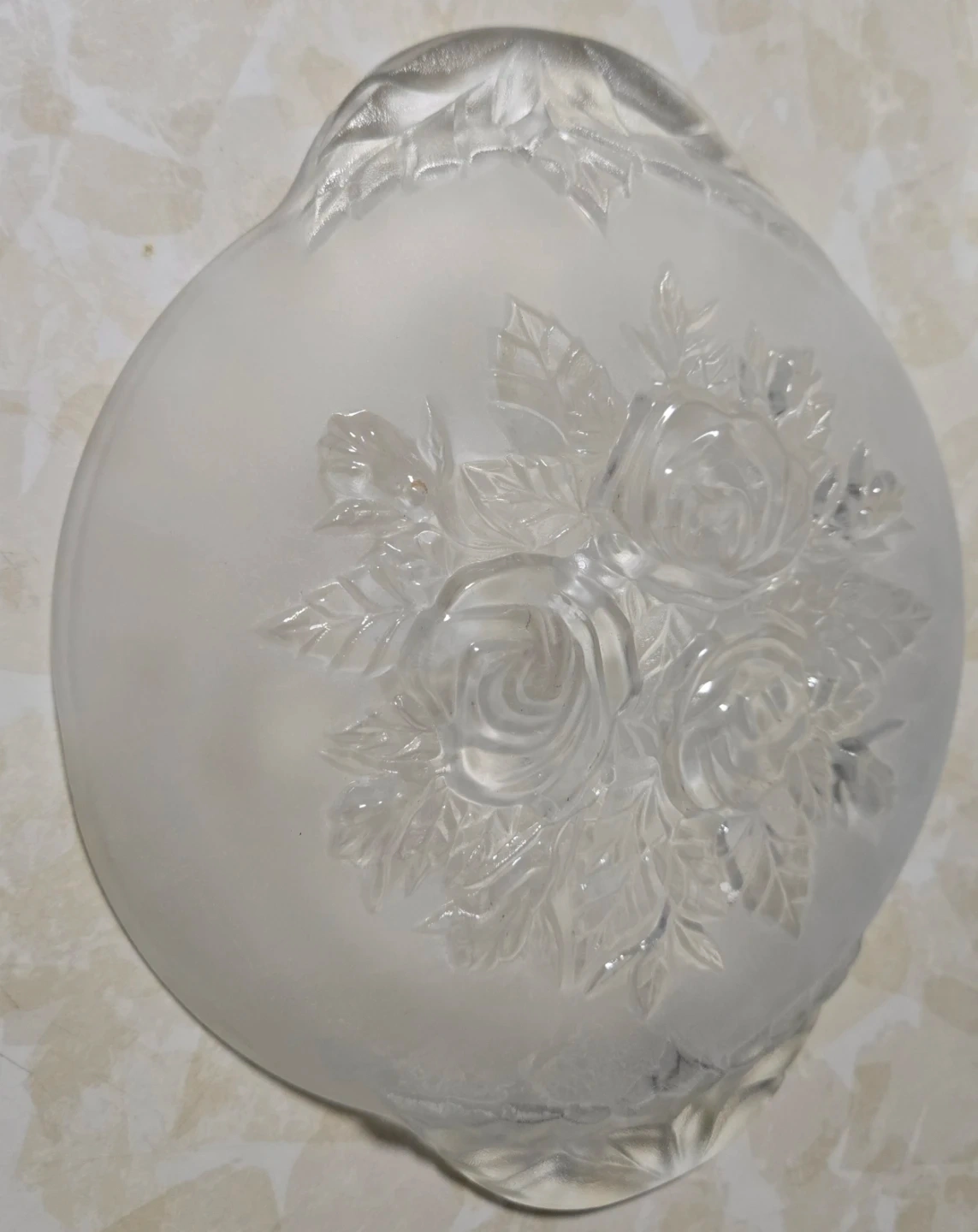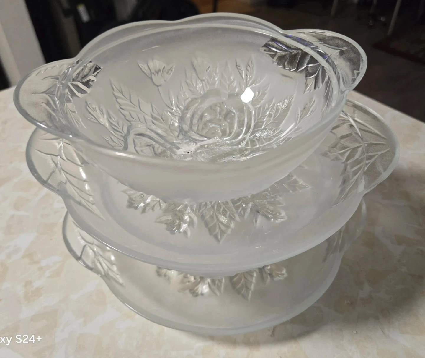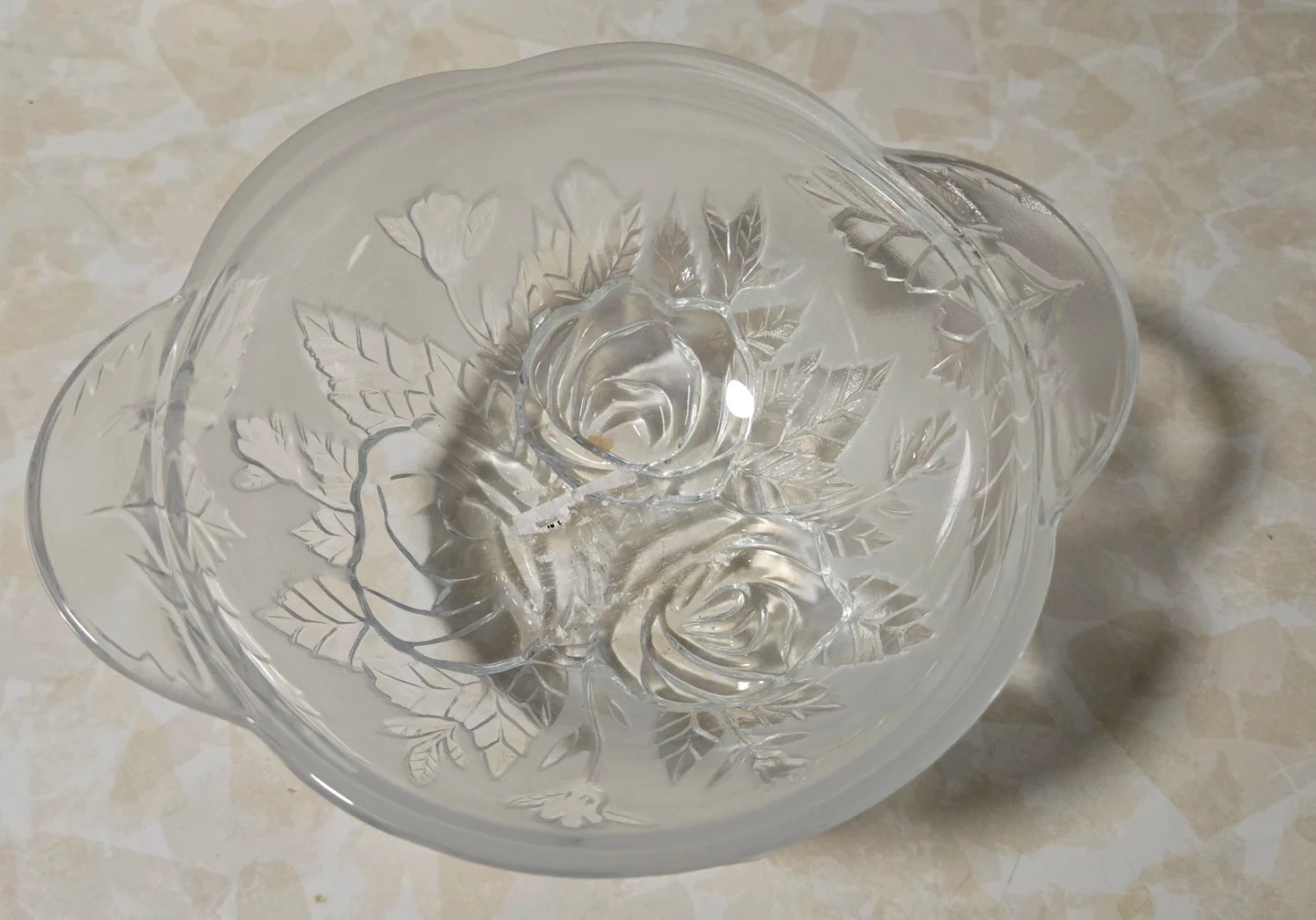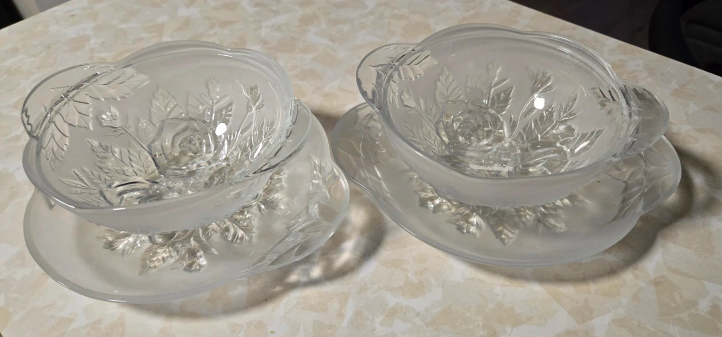 Elegant glass serving bowls with a delicate rose and leaf embossed design. Each bowl has two handles and sits on a matching saucer. This set is perfect for serving desserts or appetizers.