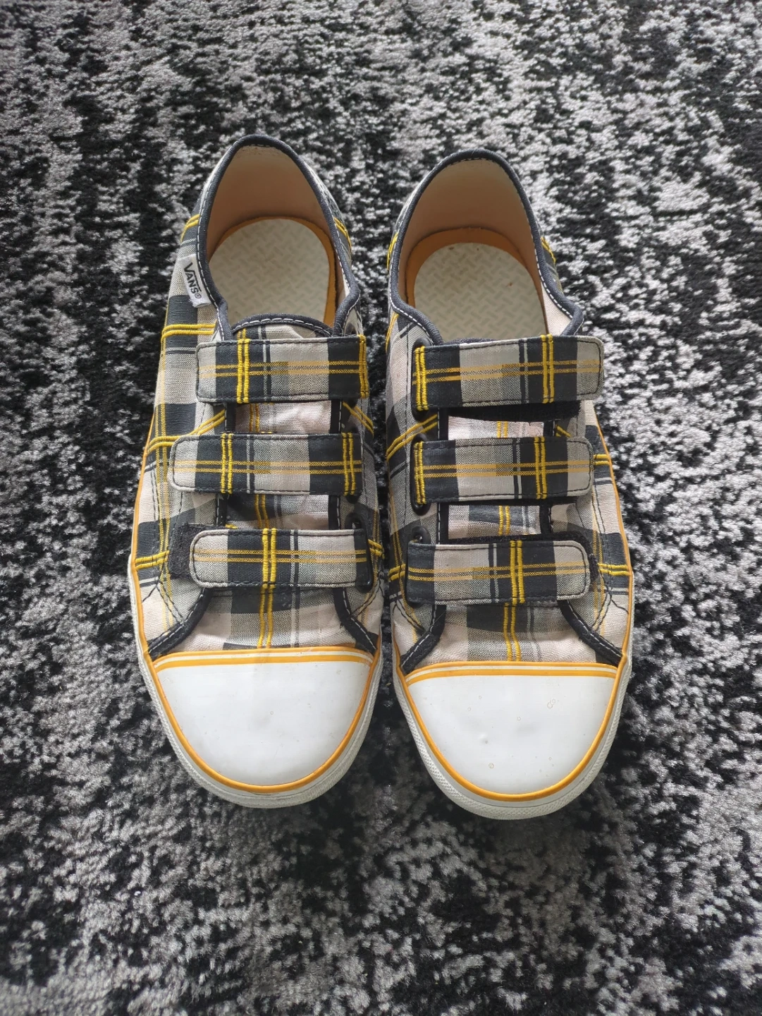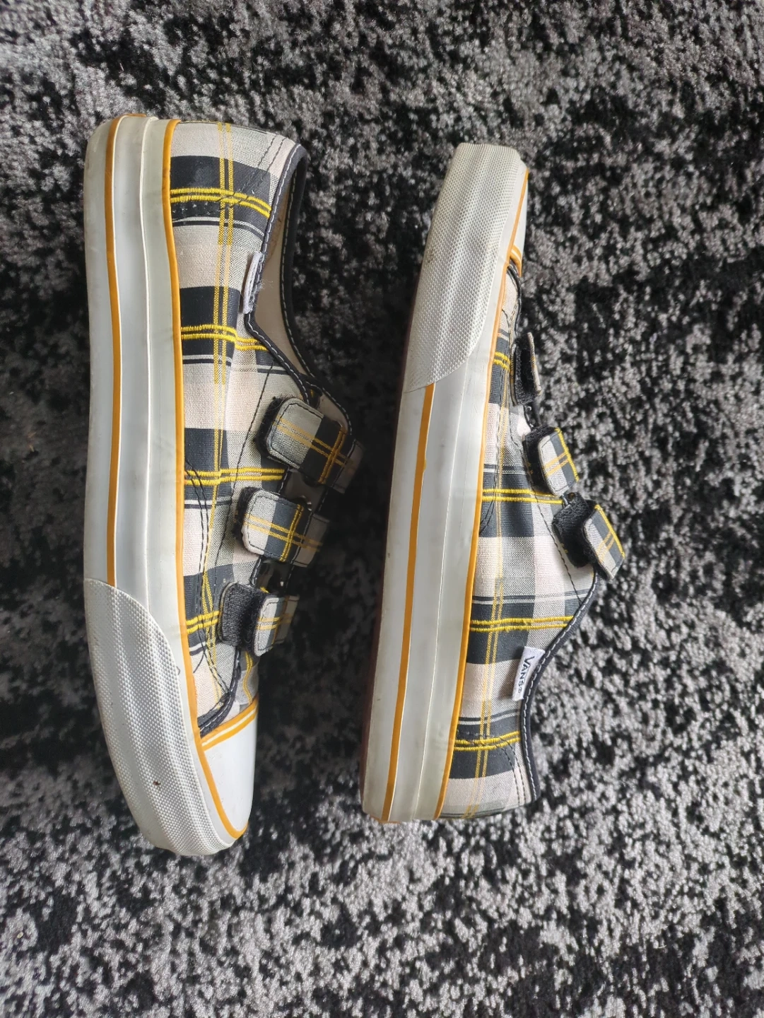 Vans sneakers with a black, white, and yellow plaid pattern. Features a hook and loop closure for easy on and off. These casual shoes are great for everyday wear.