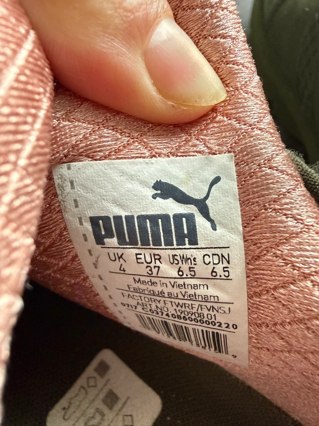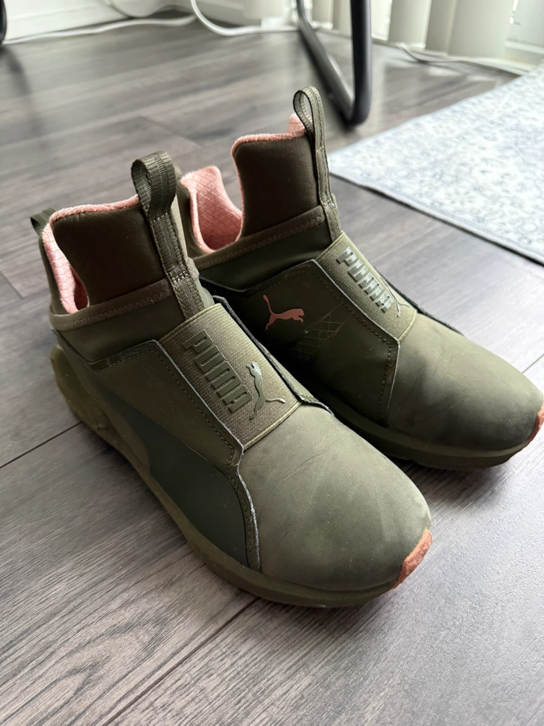 These Puma Fierce KRM sneakers come in a stylish olive green with pink accents. They're designed for a slip-on fit with a secure strap across the midfoot. The flexible knit collar provides comfort and support.
