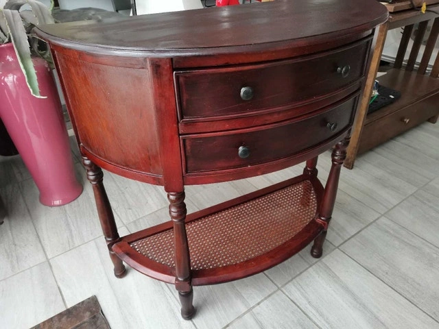 This charming, mahogany hall table boasts a semi-circular design, perfect for entryways or small spaces. It features two functional drawers and a lower shelf with a cane inlay, offering both storage and visual appeal. It is in good condition.