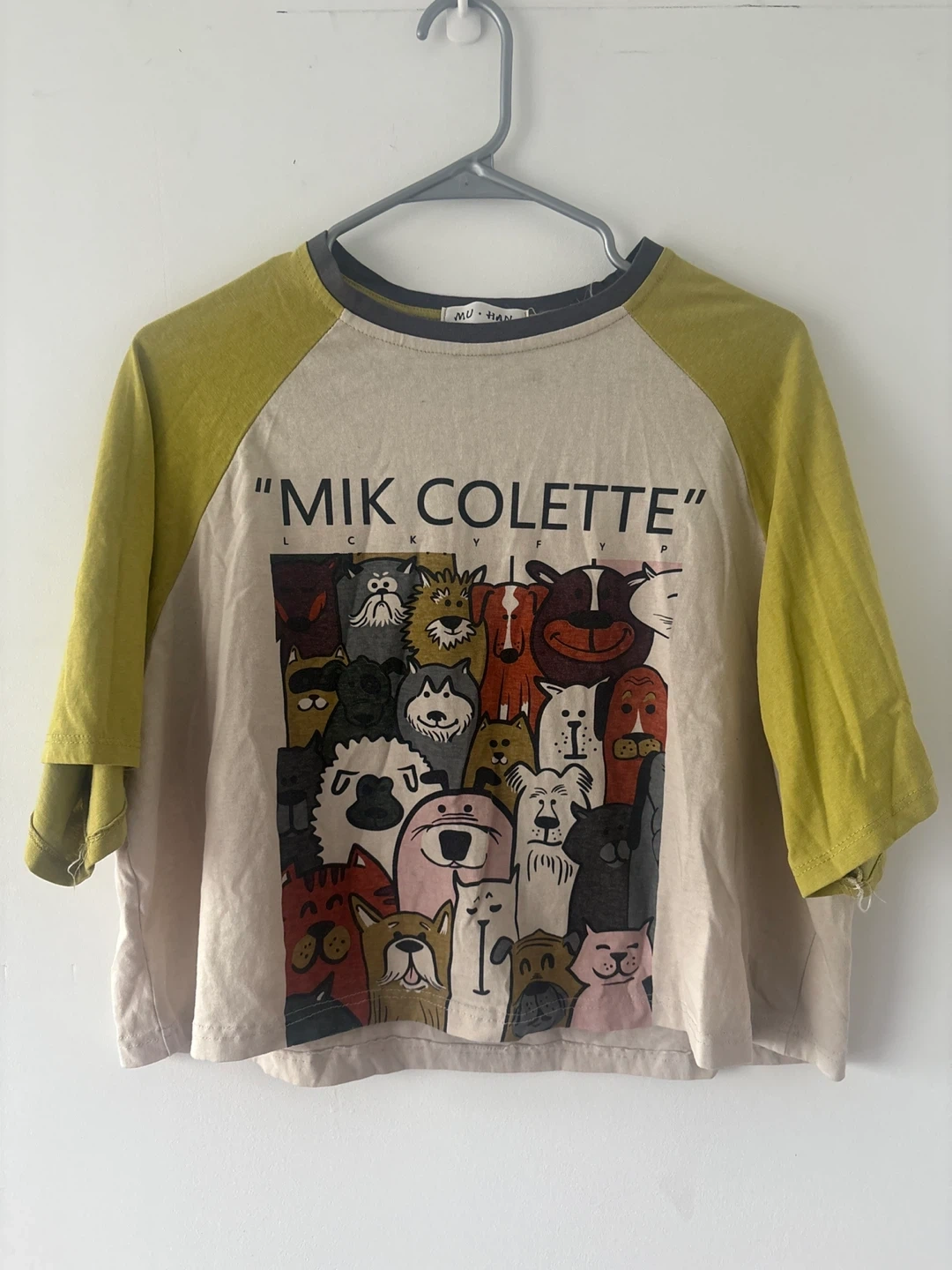 Graphic t-shirt with a "MIK COLETTE" "Lucky Typo" design. Features a raglan sleeve style with contrasting yellow sleeves and a crew neck. Made from a soft cotton blend.