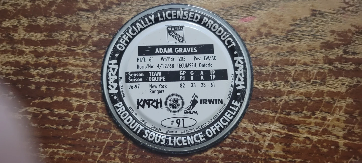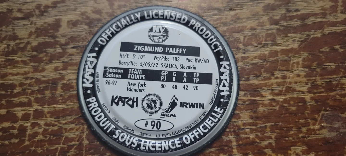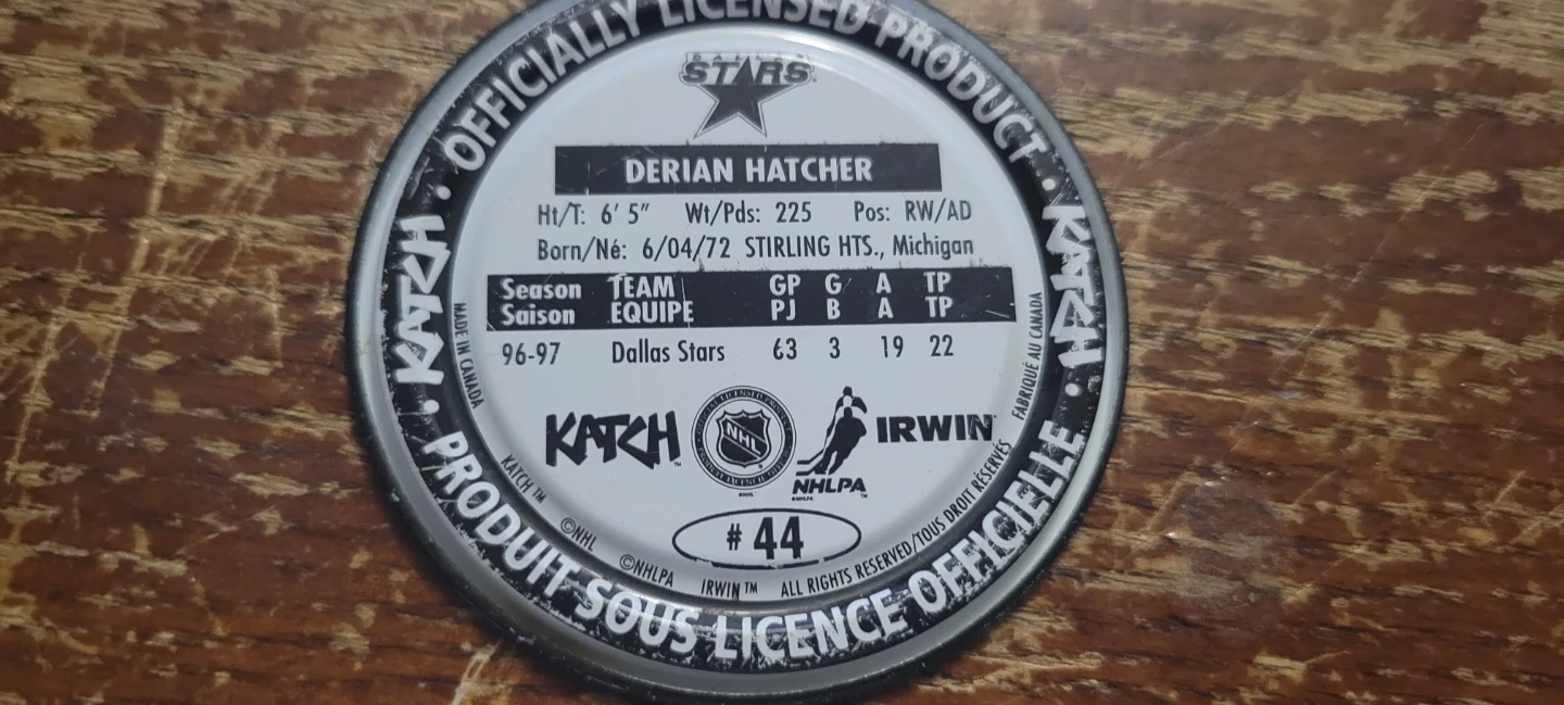 This is a collection of five Katch NHL hockey pucks. Each puck features a different player with their stats from the 96-97 season. The players featured are Daymond Langkow, Adam Graves, Bryan Berard, Derian Hatcher, and another player whose name isn't fully legible in the images. These are officially licensed products made in Canada.