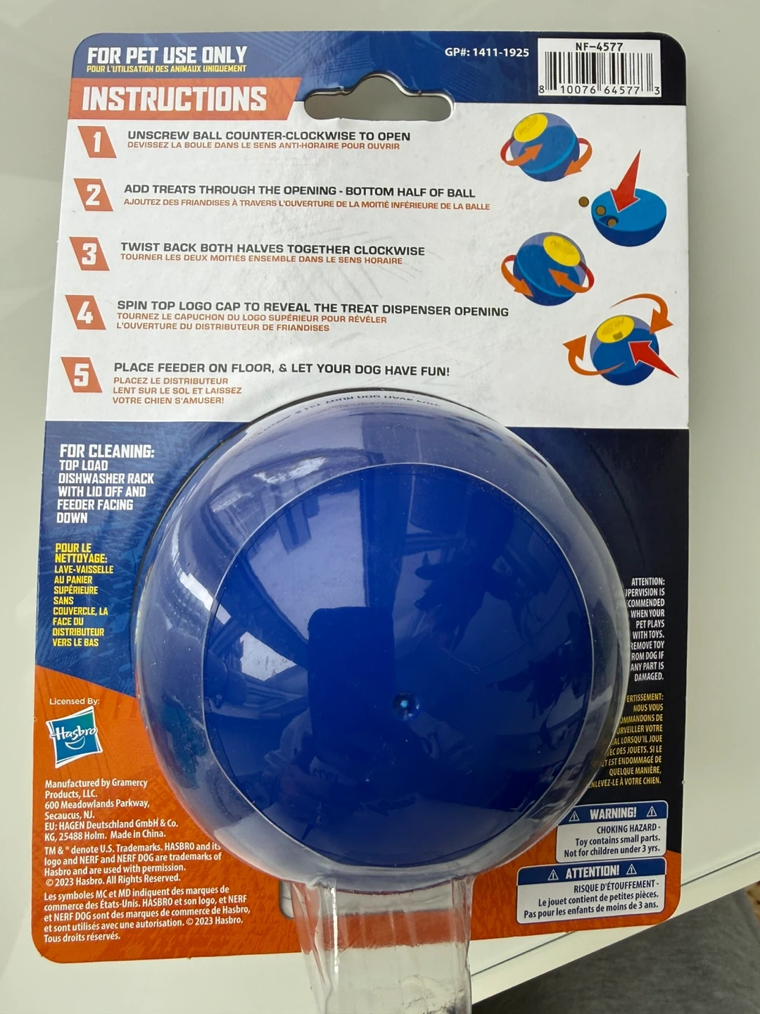 This is a Nerf Dog Puzzle Treat Ball for your furry friend. It's dishwasher safe for easy cleaning. This ball is great for engaging your dog's mind during playtime.