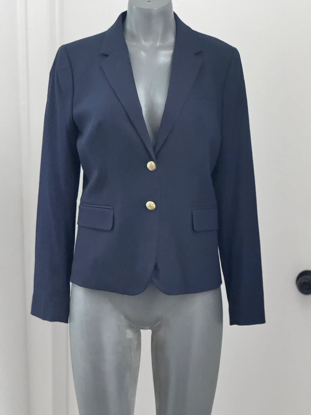 This J. Crew blazer is made from a wool blend with a polyester lining. It's a navy blue colour with gold buttons. Perfect for adding a polished touch to any outfit! NWT