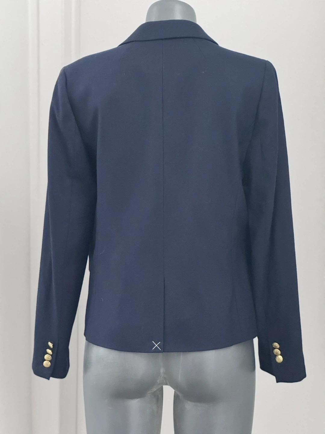 This J. Crew blazer is made from a wool blend with a polyester lining. It's a navy blue colour with gold buttons. Perfect for adding a polished touch to any outfit! NWT