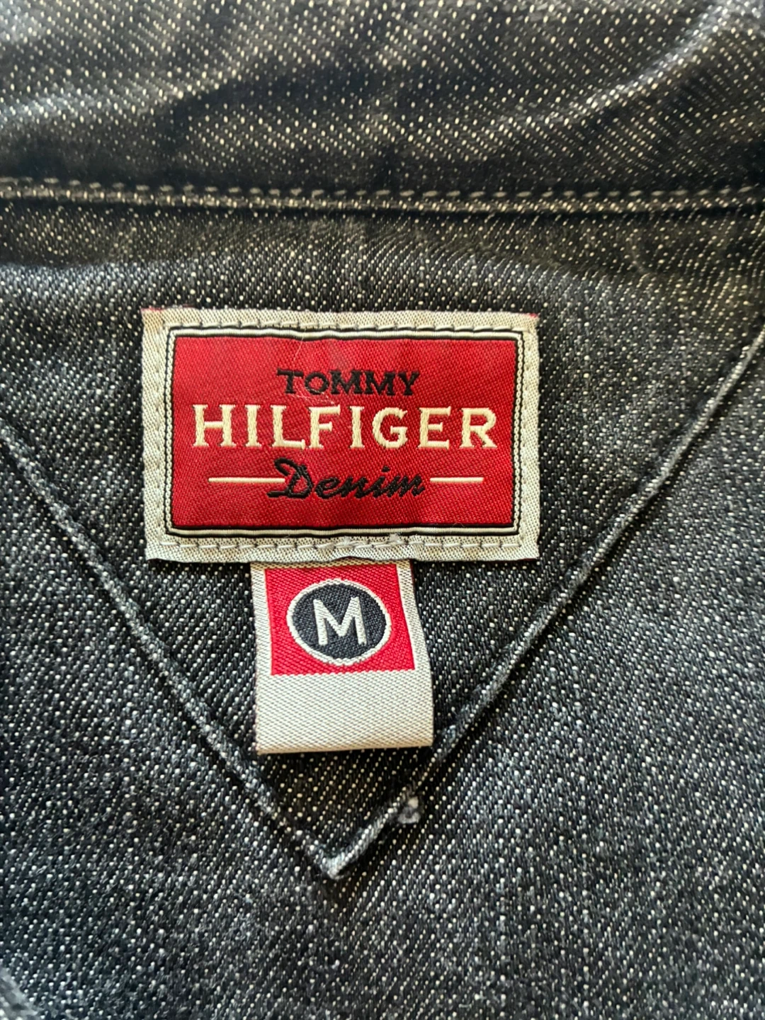 Classic Tommy Hilfiger denim jacket in a dark wash. It's a size medium and made from 99% cotton with 1% spandex. A versatile layering piece for any wardrobe!