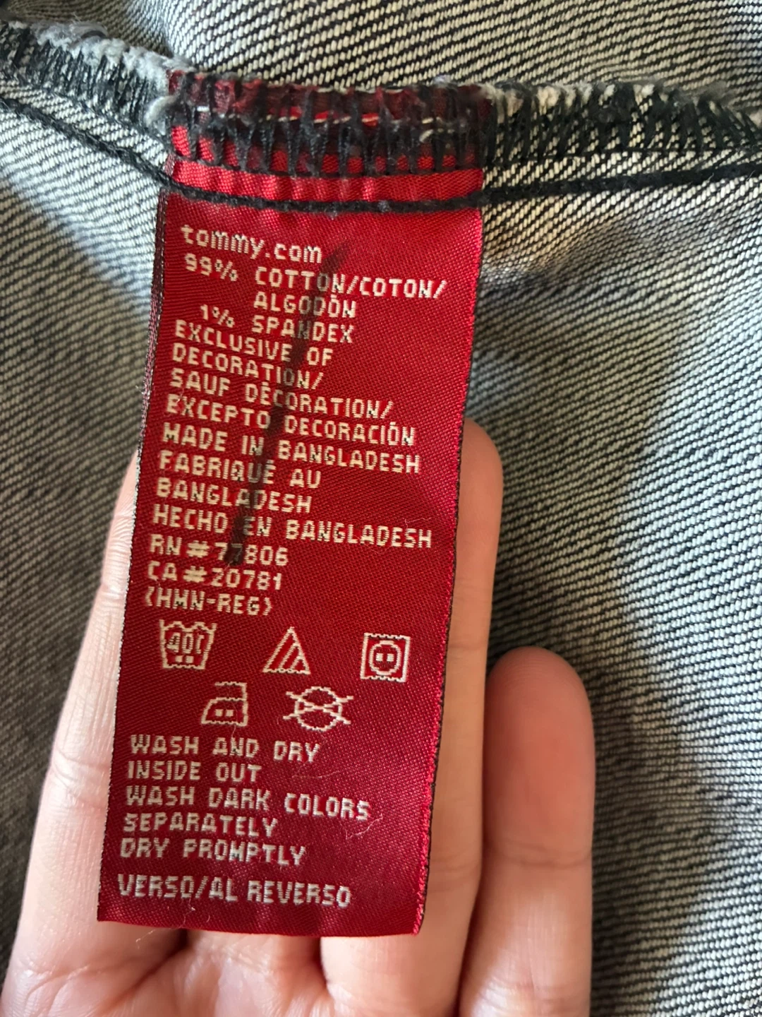 Classic Tommy Hilfiger denim jacket in a dark wash. It's a size medium and made from 99% cotton with 1% spandex. A versatile layering piece for any wardrobe!
