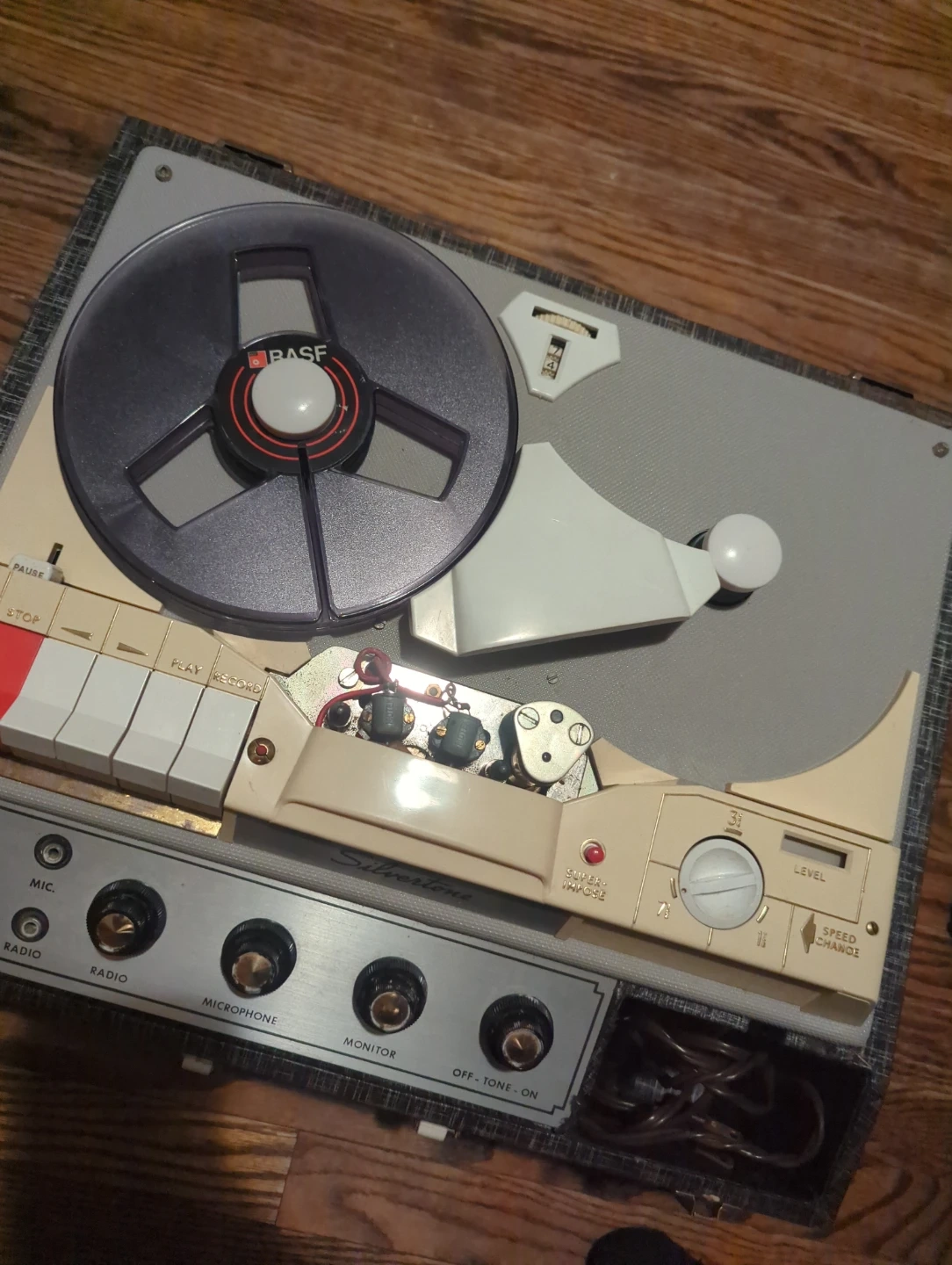 This is a vintage Silvertone reel-to-reel tape recorder. It has various controls for microphone, radio, and monitor input. This unit also features speed change options.