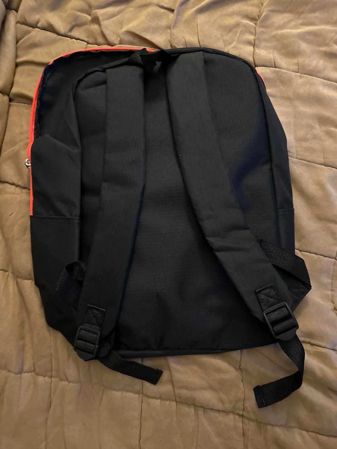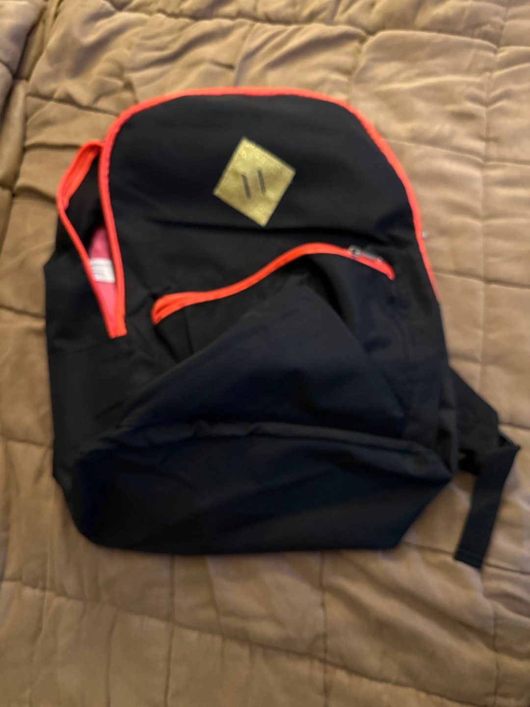 Black backpack with pink zippers. It features a gold patch on the front with a gold zipper pull. It has a large main compartment and a zippered pocket on the front. The inside of the backpack is lined with a pink fabric.