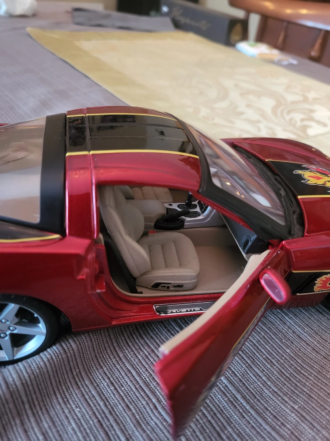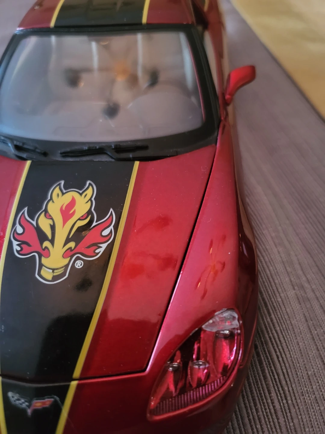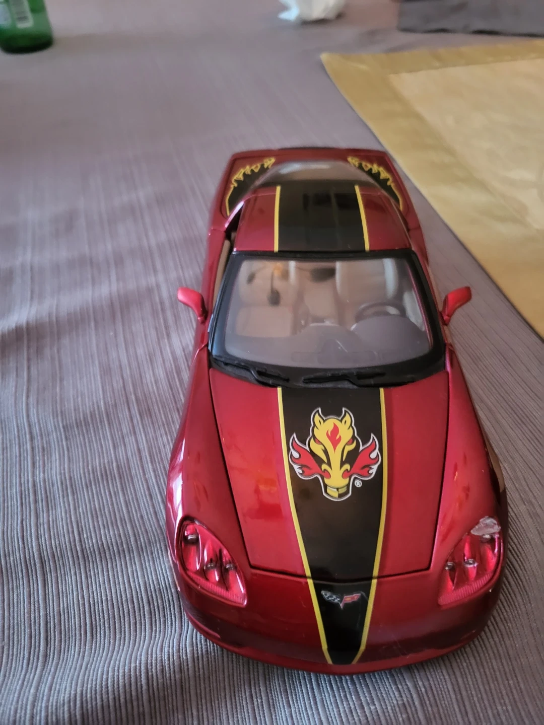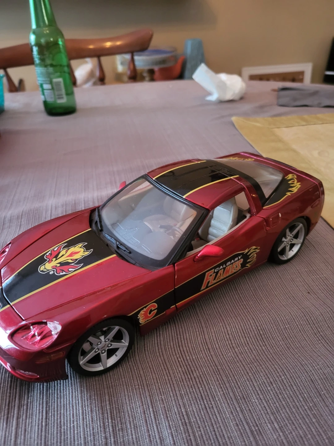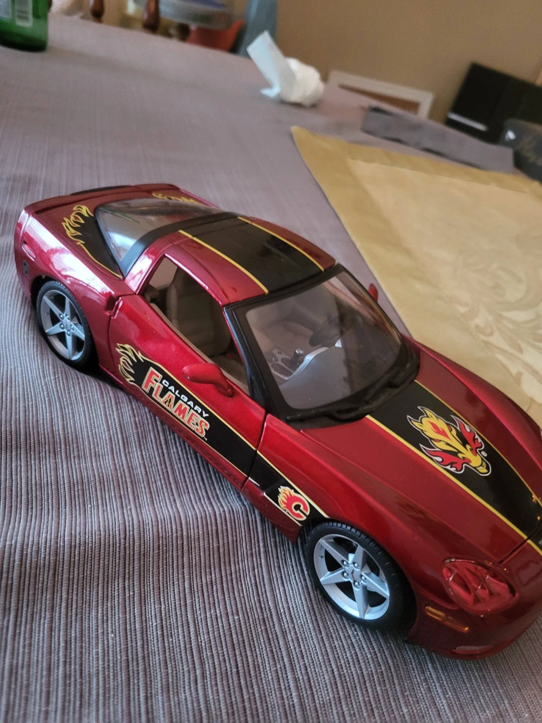 This is a red model car featuring the Calgary Flames logo and colours. The doors open and it shows interior details. A cool collectible for any hockey fan!