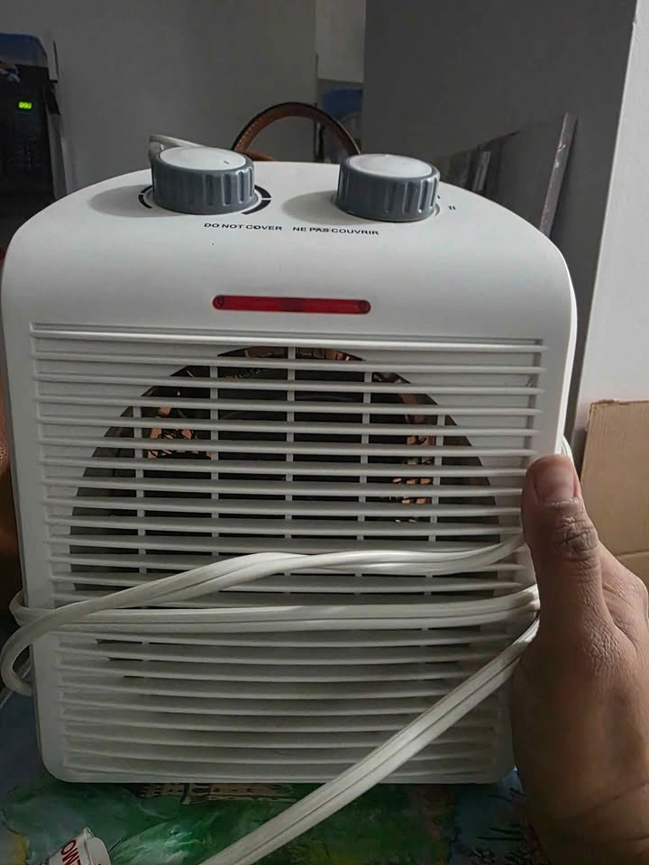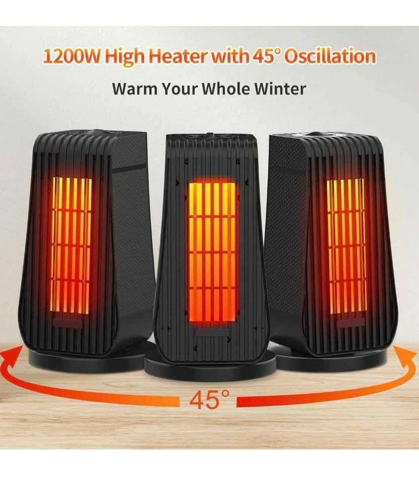 Brand new in box. Electric oscillation portable ceramic heater with thermostat. Fast heating, ultra quiet. Small space heater for office, home, or room. 1200W/600W, temperature level & 6 modes. Dimensions: 6.29 x 4.33 x 11.8 inches. Take used heater for free with this. White one in picture.