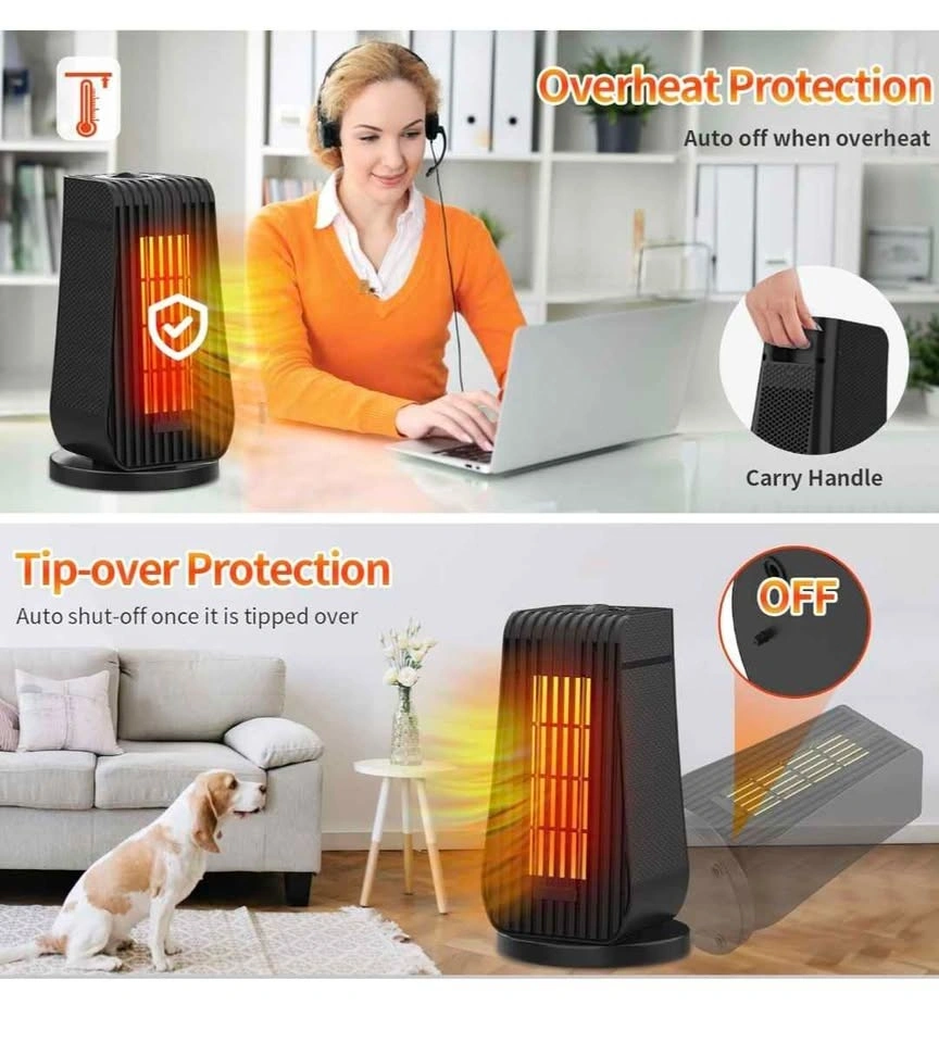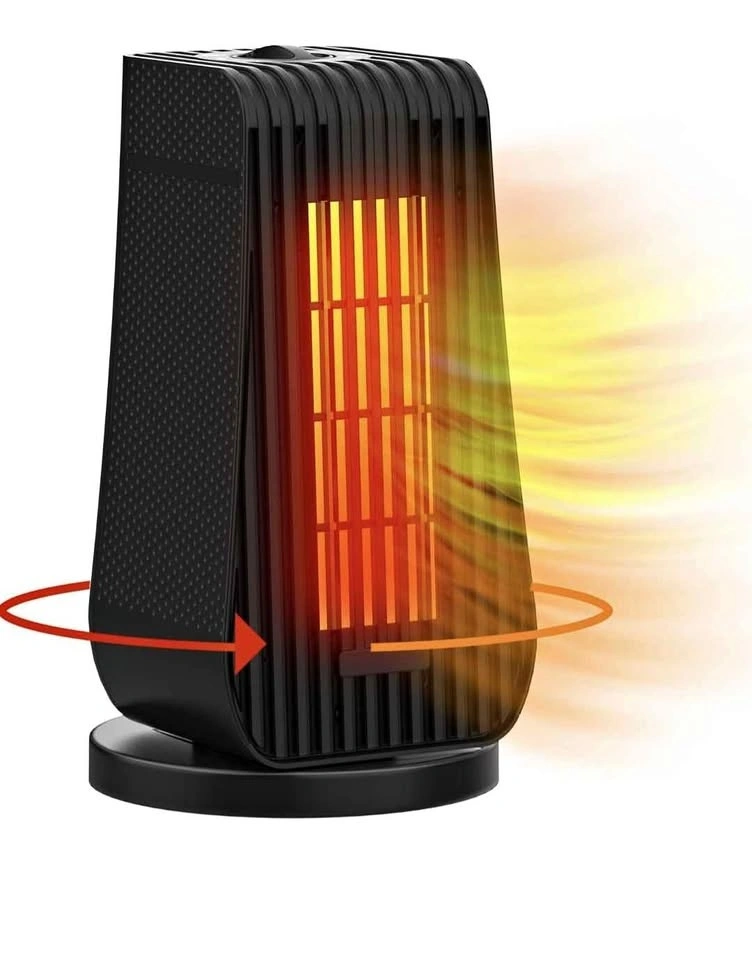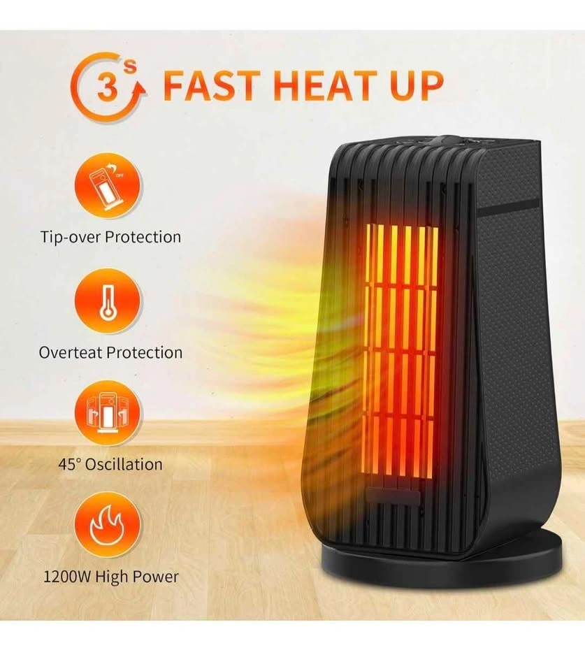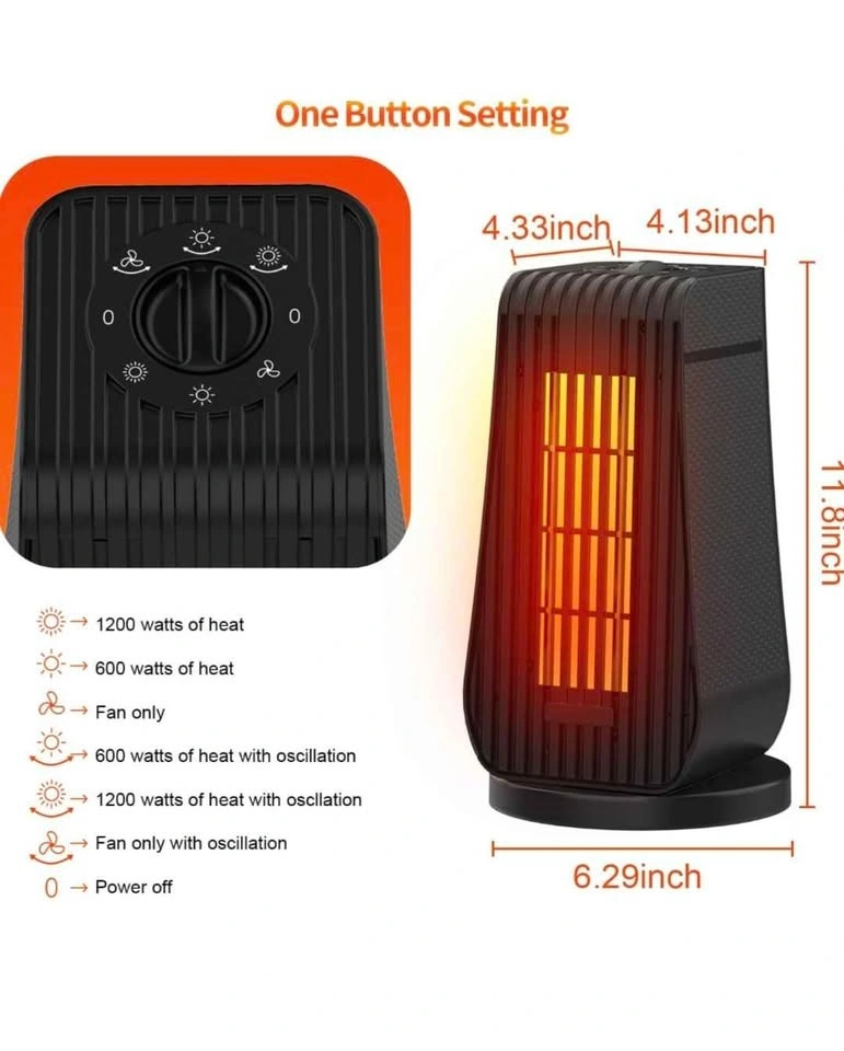 Brand new in box. Electric oscillation portable ceramic heater with thermostat. Fast heating, ultra quiet. Small space heater for office, home, or room. 1200W/600W, temperature level & 6 modes. Dimensions: 6.29 x 4.33 x 11.8 inches. Take used heater for free with this. White one in picture.